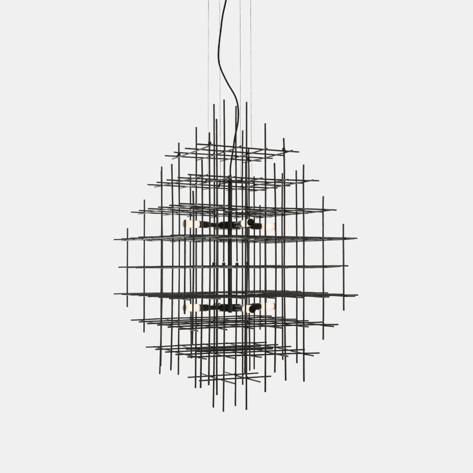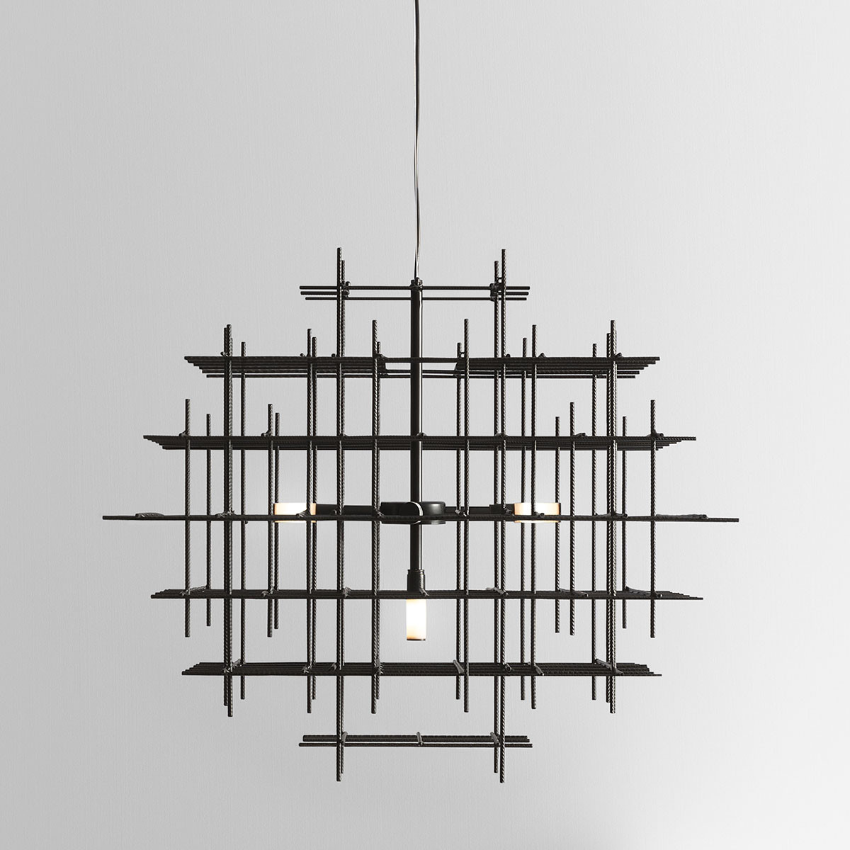 Ispirata alle armature per il cemento armato, ARMADA con il suo groviglio visivo restituisce un senso di profondità interessante, con un rapporto tra vuoti e pieni tutto da scoprire. La ricerca di un equilibrio formale tra le maglie metalliche genera volumi che sembrano nascere da segni retti tracciati nello spazio. L’anima decorativa si unisce a quella funzionale. A luce spenta, è un oggetto d’arredo con una personalità forte ma versatile. A luce accesa, il telaio di metallo saldato che abbraccia il fascio di luce, riesce a creare un effetto luce-ombra e un’atmosfera affascinante.