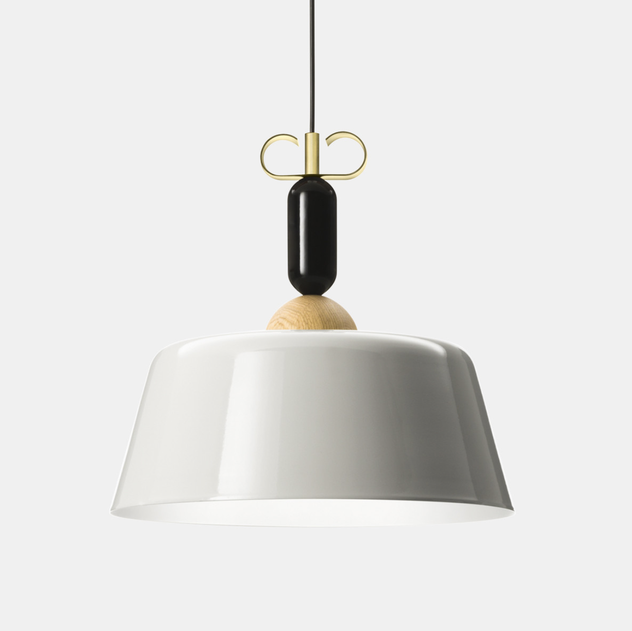 All’interno di questo scenario progettuale forme semplici e materiali diversi vengono sovrapposti a disegnare lampade intese come pezzi di gioielleria sospesi. I volumi elementari sovrapposti lungo il cavo creano micro architetture in foggia di pendenti. La composizione si chiude all’estremità con un ricciolo in ottone naturale o in rame a farfalla, chiara allusione al riferimento progettuale.