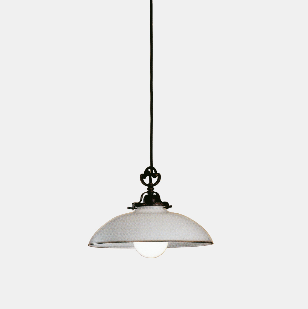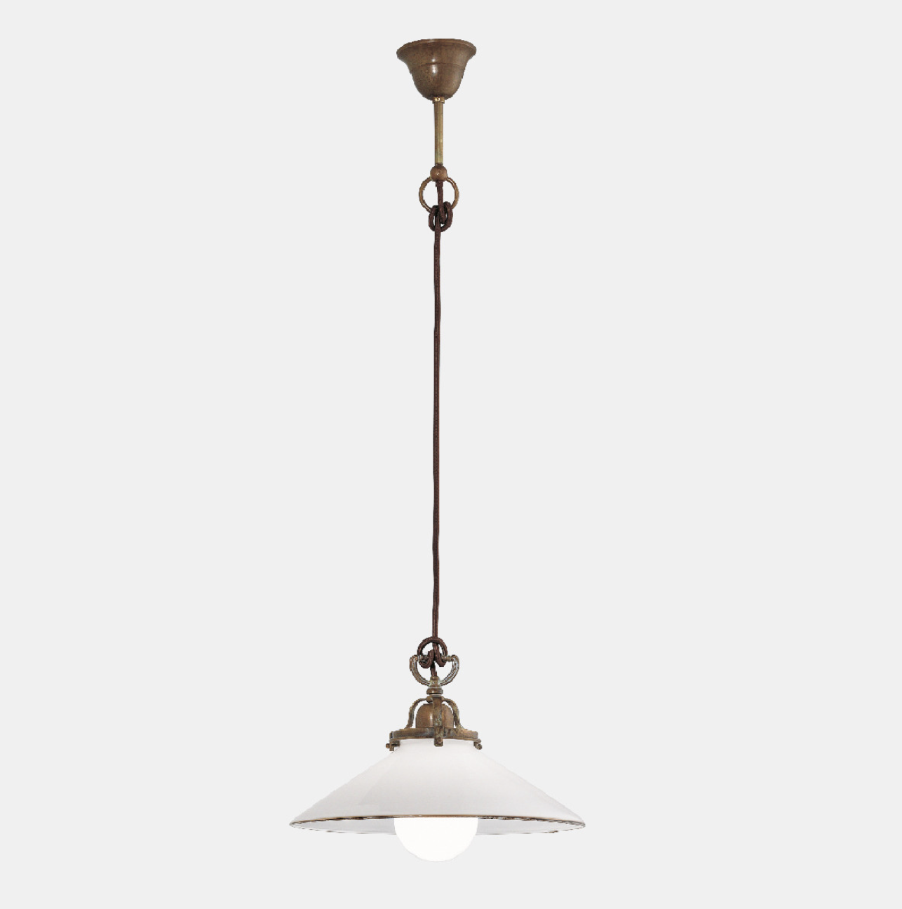 Linguaggio country internazionale e tradizione millenaria del vetro di Murano, grande espressione del made in Italy, si fondono alla perfezione nella collezione Country. Prodotte in ottone e vetro soffiato bianco, queste lampade sono peculiarmente caratterizzate dal bordo ribruciato marrone.