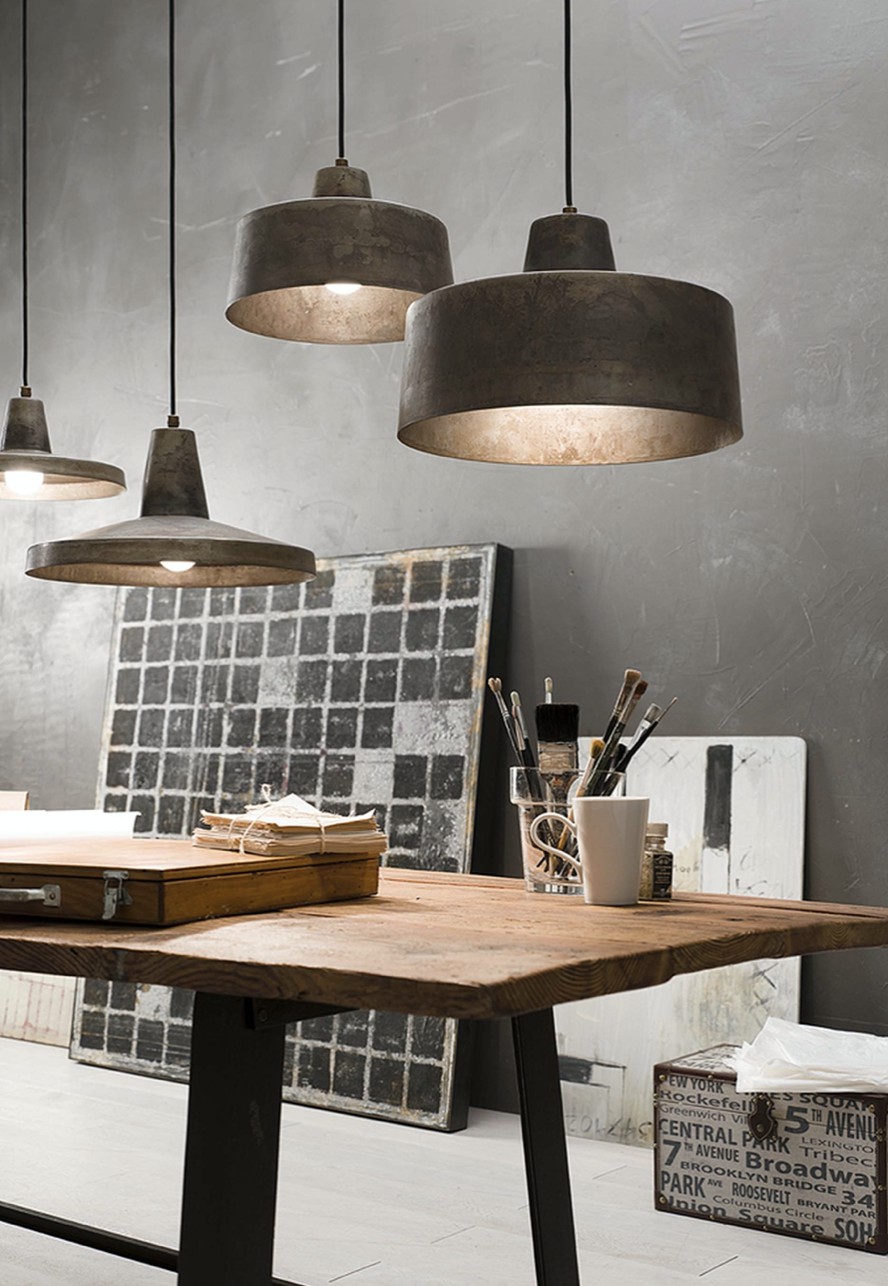 Aspetto ruvido e grezzo ma di gran ricercatezza: queste le caratteristiche di Officina, collezione di lampade a sospensione e applique da interno dal gusto tipicamente industrial in grado di creare atmosfere raffinate negli ambienti in cui sono posizionate. Prodotte in ferro, queste lampade rappresentano un omaggio ad uno stile minimal e essenziale.