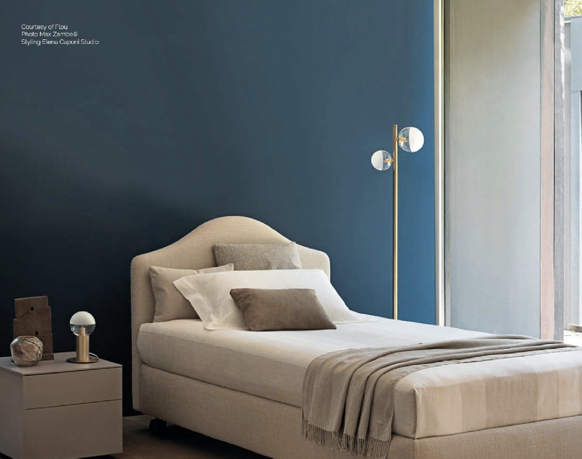 La collezione Molecola si compone di sospensione, piantana, plafoniera, applique e lampada da tavolo. Disponibile nelle versioni in ottone naturale (codice ONT) o ottone anticato (codice OOT) con sfere di vetro trasparente e sabbiato o in ottone verniciato nero e sfere di vetro ramato (codice NNR).