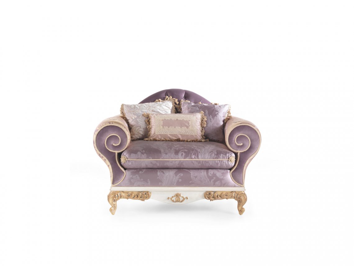 ARMCHAIR WITH STRUCTURE IN BEECHWOOD. PADDING IN FOAM. UPHOLSTERY IN FABRIC WITH DECORATIVE FRINGE.