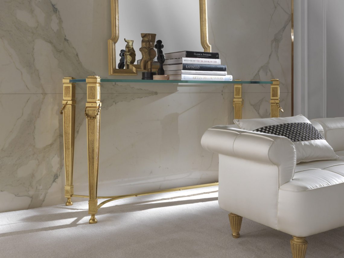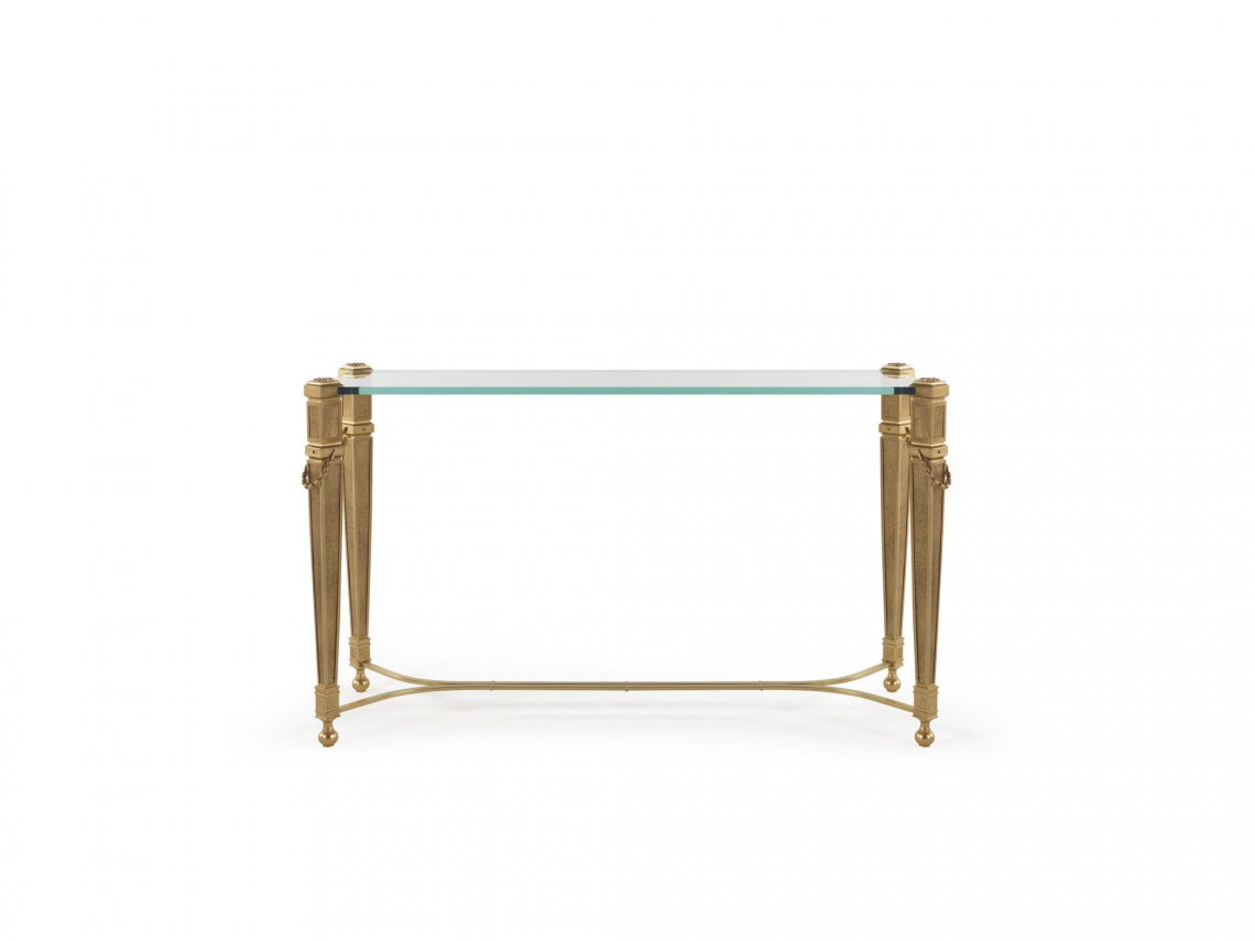 CONSOLE WITH STRUCTURE IN METAL WITH GOLD FINISHING. LOST-WAX CASTED DECORATIVE ELEMENTS. TOP IN EXTRA LIGHT GLASS.
