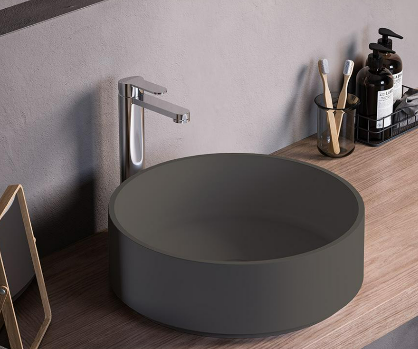 Countertop round washbasin in matt colored Mineralmarmo or in matt white Solid Surface, with possibility of external Colour finish, glossy or matt.