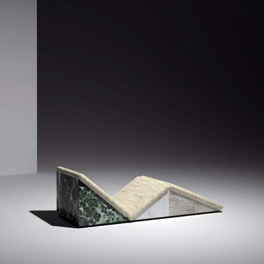 MARMINI II is despite its minimalistic architectural appearance a comfortable upholstered stool. It is composed of three volumes that apparently do not seem to be able to stay together, two hard parts in ‘Fior di Pesco’ marble that seem to want to detach themselves from the central part of the upholstered soft padding.