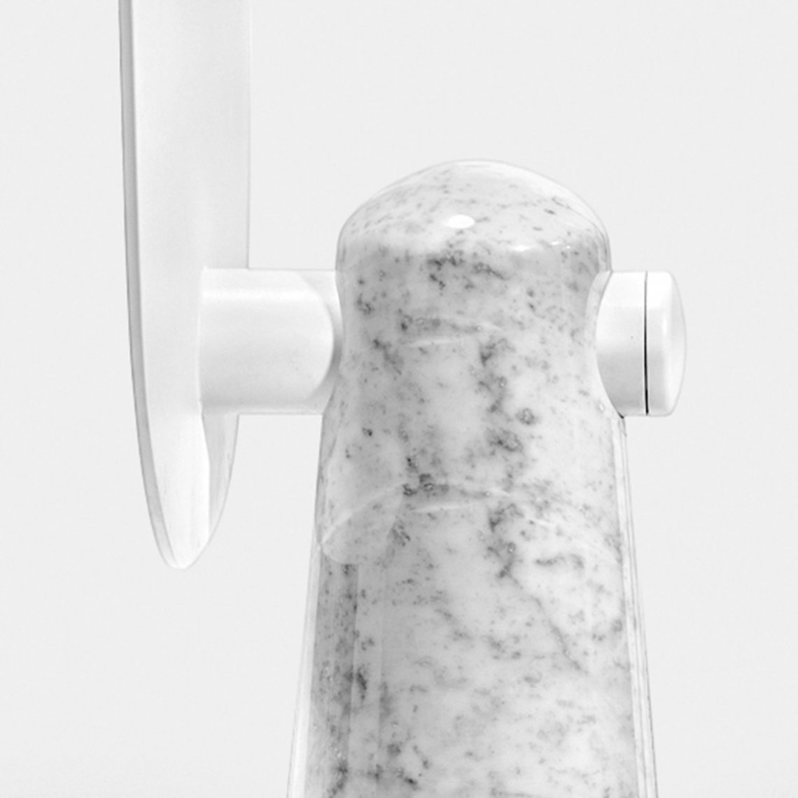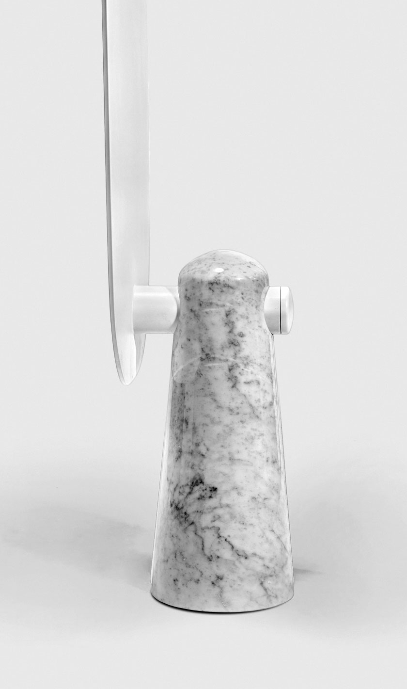 Iconic is a mirror that proudly stands as a statue. The white or black marble base pedestal supports a thin metal structure.