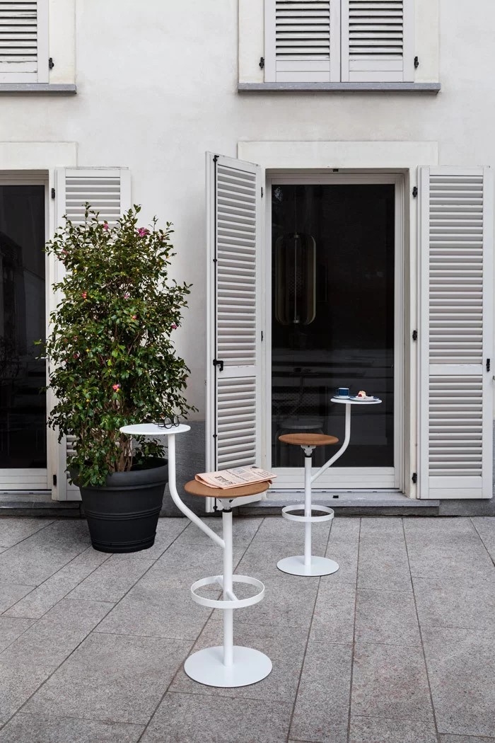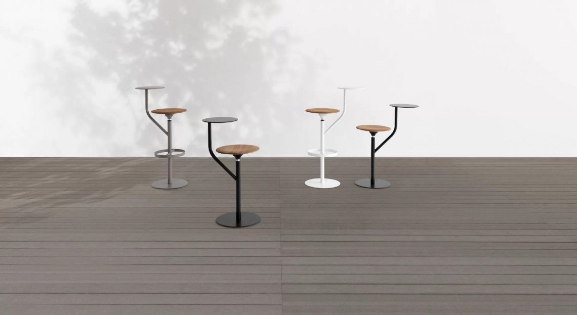 In un’unica linea, dinamica e minimale, due funzioni, sgabello e tavolino insieme. Si chiama AARON, doppia a nel nome, per sottolineare la generosità multi-tasking di un disegno che limita lo spazio d’ingombro e garantisce privacy e relax anche in ambienti outdoor. Da uno stelo in metallo, germogliano un sedile accogliente in legno Iroko e un piano d’appoggio girevole in alluminio. Funzionalità ed eleganza per arredare ambienti esterni contemporanei dedicati alla ristorazione, al lavoro o all’attesa.