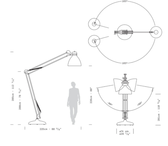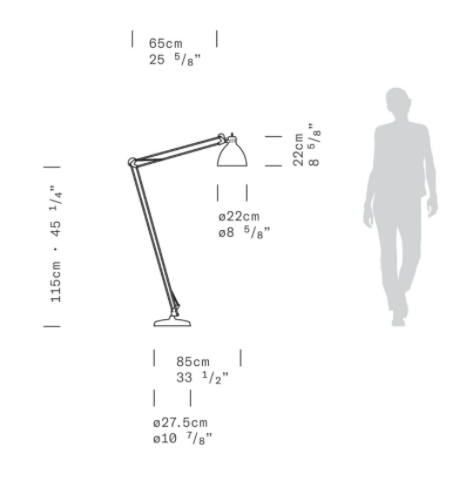 Large scale, matte lacquered, aluminum floor lamp. Available in six colors options with outdoor grade finish for maximum UV protection on both outdoor and indoor versions: white, black, amarant red, mica blue, sablé grey and rust brown with matching steel base. Interior of the diffuser in white lacquer. Custom colors available upon request. Dimmable LED light source (user replaceable). Dimmer on cord (push-dim) or with wireless CASAMBI? Smart Lighting Control.
