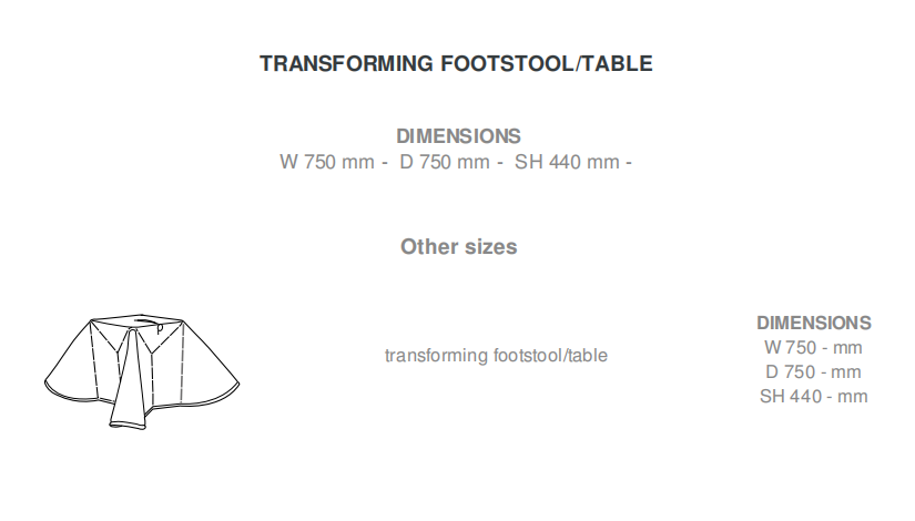 Gregory is a footstool/table which transforms into a rug (and vice versa) in one simple operation. It will appeal to children of all ages; to ladies, as an ideal complement to a dressing table; to those to whom space is at a premium (a compact rug doubling as an additional seat); to those of a poetic nature, who are fascinated by a new, simple and ingenious idea; and finally to the more practical or economic amongst us, who love to get two objects for the price of one