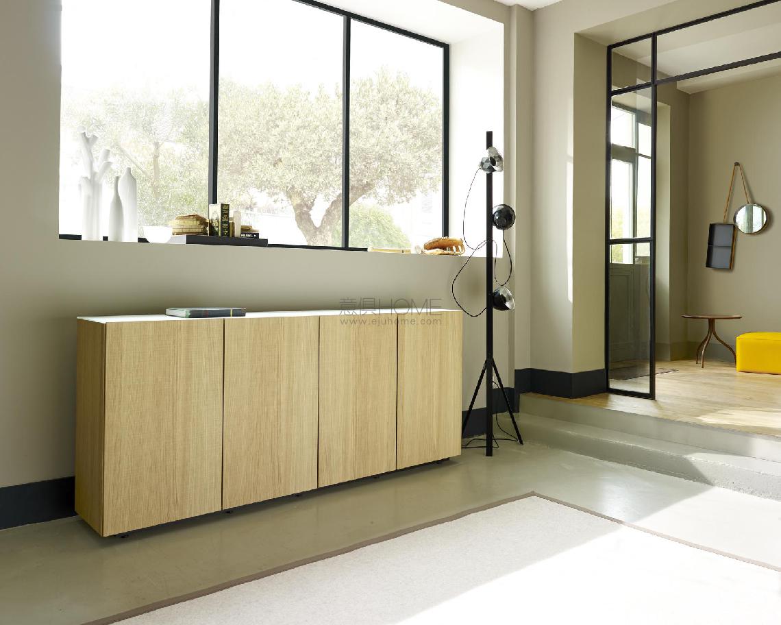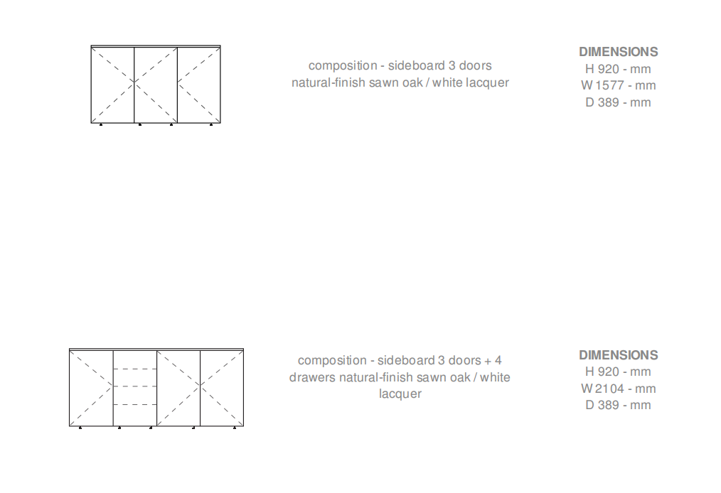 Et cetera is a vertically-constructed programme (assemblies of side panels, shelves, back panels and fronts). Basically a range of shelving, it is further enriched by the additional functions of an occasional unit: storage (opaque or glass doors, shelves, drawers), audiovisual equipment and lighting. The name Et cetera evokes its dimensional possibilities: one can always add to its height (the highest standard side panel is 2676 mm) with the possibility of tailoring it perfectly to your particular space (cut down). Et cetera's elegance stems from rigorous aesthetic choices, as much in terms of its volumes as its finishes: - Readability of compositions facilitated by the subtle use of a network of single modules of 175 mm. - Lightness of the overall structure thanks to the chosen thickness of 30 mm for side panels and shelves, the perfect compromise between the necessary reassuring thickness and the desired visual lightness. - Single overall depth of 382 mm. Made possible by the reduction in depth of audiovisual equipment, this makes it possible to create items which fit more easily into the required space since they are shallower and 'flat' in terms of surface. - Slimness of the grooved hinged doors (also the flap doors): their minimal thickness (around 6 mm) overlaps the edges of the structure. Their elegant minimalism is reinforced by their handle- free, 'push to open' operation. - Originality of the storage surfaces for open niches: offered in a range of widths, their at once playful and functional appearance creates an interesting graphic emphasis with a play on linear repetition. - Lightness accentuated by the choice of finishes: the structure of Et cetera is always in satin lacquer (white or argile). Fronts are either lacquered or enriched with veneer, the chosen species of which, sawn-effect oak, is offered in natural, anthracite or black. A special shelving unit is also available which, being double-sided (unlike the rest of the items in the range, which are all single-sided), may be used as a room divider. This shelving unit is available in size 10M 12T (centre to centre distance H 1750 W 2100; actual dimensions H 1800 W 2130) and offers 5 levels of storage with either U-shaped lacquered niches or blocks of chests finished in smooth oak veneer. In the case of the sideboard, the structures and fronts are priced separately to make it possible to mix all the finishes on offer. That said, the following combinations are recommended: interior of structure in white lacquer/fronts in natural sawn oak or interior of structure in argile lacquer with black lacquered top/fronts in anthracite-stained sawn oak. As a complement to the existing lacquer finishes (white, argile, elephant), certain elements of this range are also available in the following 13 lacquer colours: rouge, brique, bleu, plomb, azur, bleu lavande, chocolat, moutarde, mastic, ranger, noir, perle, bleu nuit.