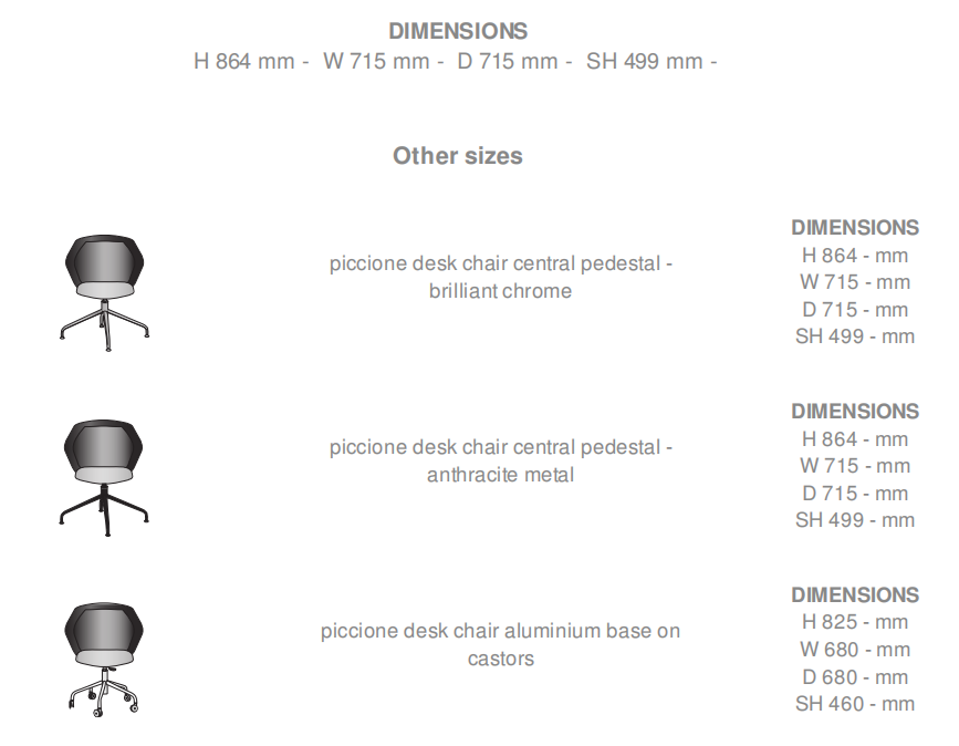 - 1 rotating 4-branch base without castors, finished in brilliant-chromed steel. - 1 rotating 4-branch base without castors, in grained anthracite-finish steel. - 1 rotating, height-adjustable 5-branch base on castors, in polished aluminium. - 1 rotating, height-adjustable 5-branch base on castors, in grained black-finish aluminium. For both chairs and bridges equipped with a 5- branch base on castors, the minimum and maximum heights and seat heights are indicated beneath each item.
