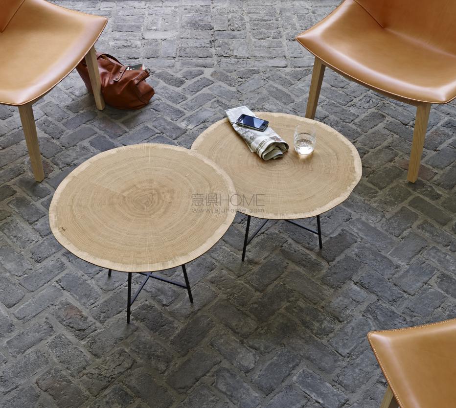 Occasional table with top in transversal cut oak veneer and black lacquered steel base. Given the irregular shape of the top it is possible that the able may differ slightly from the maximum dimensions quoted above.