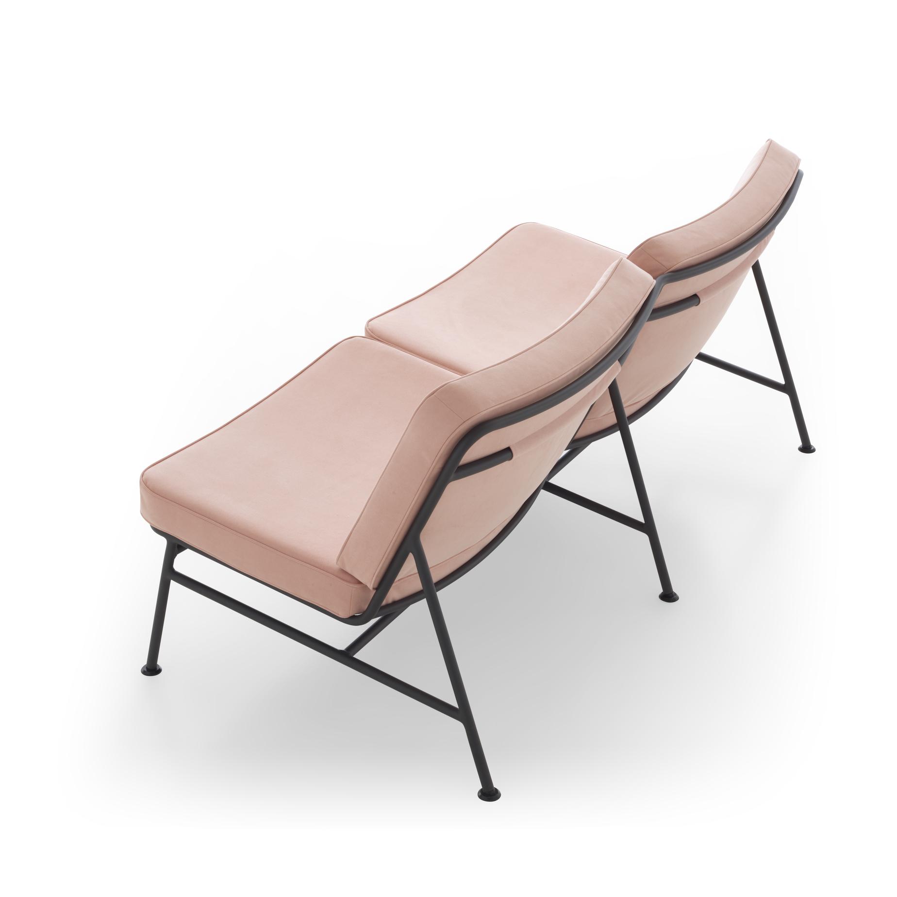 Backpack, the collection of seating designed by the LucidiPevere design studio, has a brand new look. Now with lesser dimensions than it had at its first outing in 2017, it is available in an indoor or outdoor version. Consisting of a 2-seat settee, armchair and footstool, this collection makes a real design statement. There is a complementarity between the various materials used: the structure in charbon-lacquered aluminium and the seat covered in a technical fabric show to best effect its informal lines and welcoming, ergonomic curves. Central to this creation are the colours, always sombre, which are evocative of walks in the countryside. Finally, the soft cushions made using specific fabrics serve to augment the sense of comfort. A range which surprises as much by its simplicity, evident at first glance, as it does by its lightness, which is not only visual but also real.