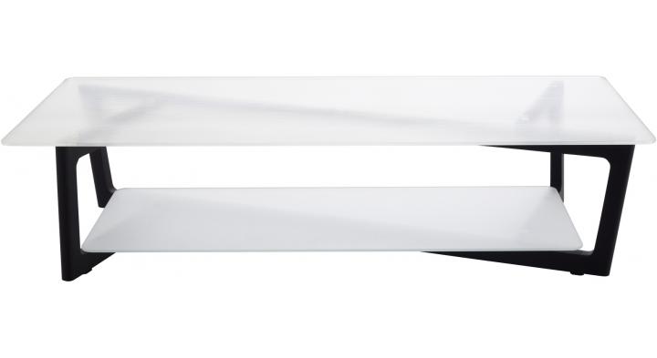 The totally new design springs from a rotational shift of the base and tops, moving the attention from the familiar to the unexpected. Here, it is the diagonal and not the right angle which directs the base of the Décalage low table: its basic use remains but the shape has changed and sends the gaze in a new direction. The moiré effect of the ridged glass enriches the perception of infinity, where everything appears to be sloping even though everything is straight. The 8 mm thick upper sheet of toughened glass is ridged with fine stripes ; the 6 mm thick lower glass is acid-frosted on its upper face (silky feel). The base is in black-stained solid ash, assembled at differing angles to achieve a purposeful, elegant shape. The juxtaposition of the two elements forms a unique pattern, the effect of which is further reinforced when viewed from above, amplifying the asymmetry.