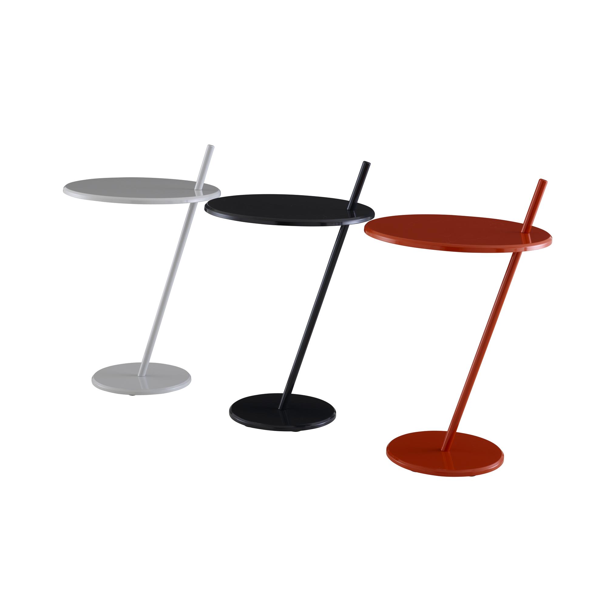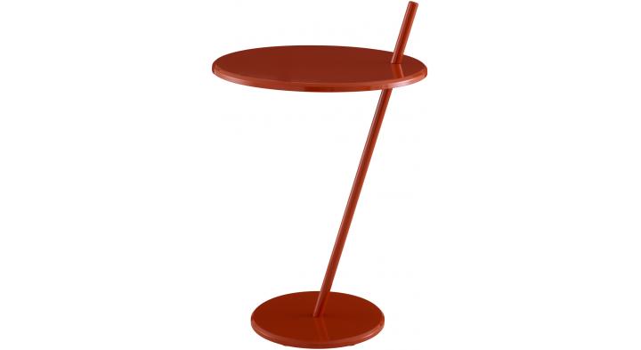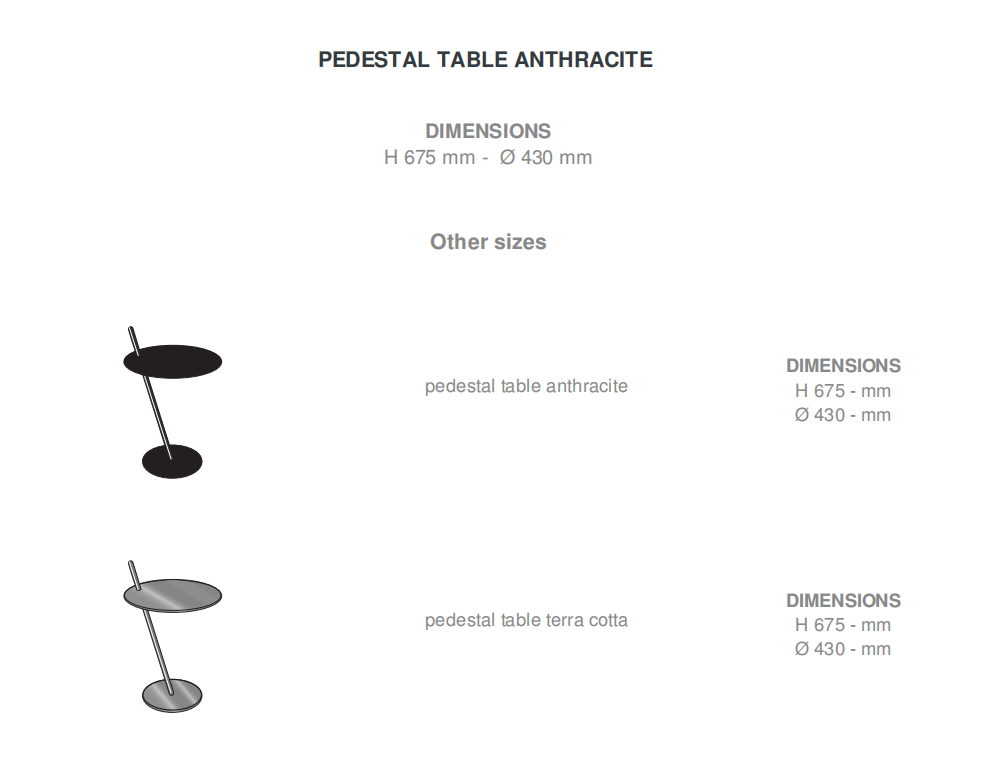 Pedestal table with base and top in MDF, covered in gloss-lacquered repoussé steel. Base in gloss-lacquered steel. Max. load on top : 10 Kg.