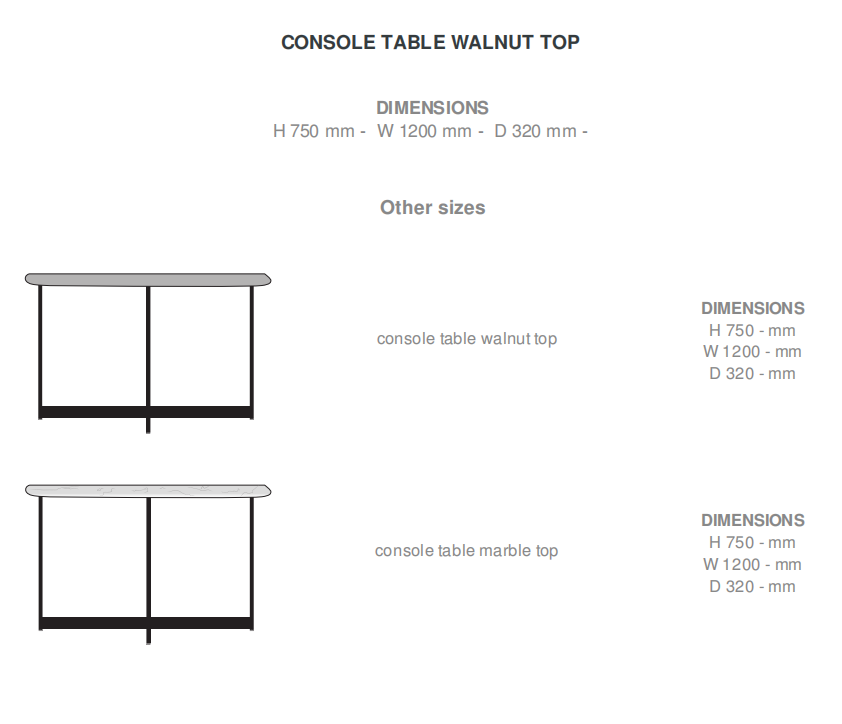 The Istrana console, named after the village near Treviso, is a model of simplicity. The design of its black lacquered steel base and top in either solid American walnut or Carrara marble with soap-style edges, is minimalist and elegant. A console for retaining only that which is essential. Structure in satin varnished black lacquered steel (with adjustable jack); top in clear satin varnished solid American walnut. Supplied with a wall fixing bracket which is strongly recommended to be used to guarantee stability. The Istrana console, named after the village near Treviso, is a model of simplicity. The design of its black lacquered steel base and top in either solid American walnut or Carrara marble with soap-style edges, is minimalist and elegant. A console for retaining only that which is essential. Structure in satin varnished black lacquered steel (with adjustable jack); top in polished Carrara marble with anti-stain treatment. Supplied with a wall fixing bracket which is strongly recommended to be used to guarantee stability.