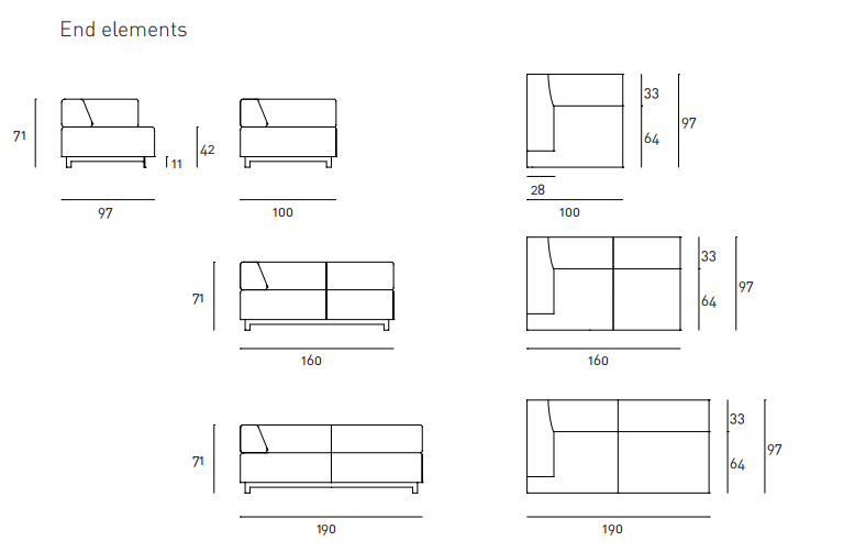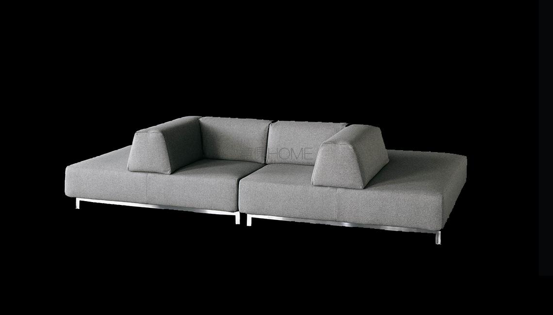Fix or modular sofa with lacquered steel frame. Support in beech plywood slats. Armrests and backrests structure in double-panelled poplar and pine. Pin and bush enabling the backrest and armrest to be unhooked from the frame to allow removal of the covers, for fabric upholstery only. Padding with differentiated density polyurethane foam. Covering in needle punched, resinated, nonwoven polyester fibre, bonded onto a polyamide velveteen backing. Steel base with satin nickel-finish. Fabric or leather upholstery. The fabric version only is fully removable by zippers and Velcro fastenings. The various elements are joined together by means of hooks. Seat depth 65cm.