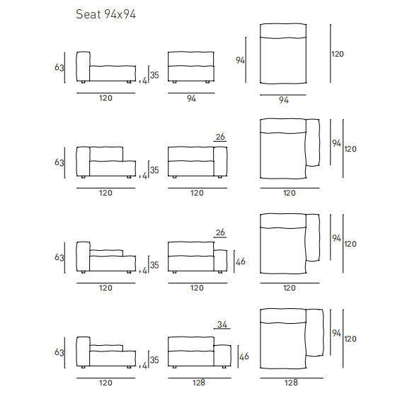 Different modular elements. Frame in double-paneled poplar and pine. Cross-woven, coated rubber elastic straps. Padding in differentiated density polyurethane foam covered with a quilted mat in prewashed and sterilized goose down, stitched into separated compartments or in differentiated density polyurethane foam and visco-soft “Xtra-pur” covered with acrylic fibre layers. Black adjustable PVC feet or in stainless steel, with matt satin-finish. Fabric or leather upholstery, both fully removable by Velcro fastenings. The various elements are joined together by means of hooks. Seat depth 68-94cm.
