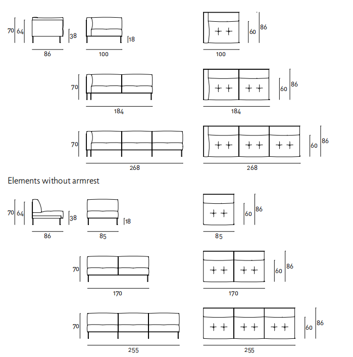 Supporting structure in lacquered drawn tubular steel, seat sprung with coated rubber elastic straps and polyurethane foam. Backrest and armrest structure in self-supporting decorative HPL panel. Covering in 100% polyether, thermally bonded onto a polyamide velveteen backing. Backrest and seat cushions in prewashed and sterilized goose down, with polyurethane foam insert. The seat cushions are quilted with buttons at sight or, on request, quilted without buttons. Armrest cushions in polyurethane foam covered with prewashed and sterilized goose down, with a poplar plywood supporting panel fixed to the frame by plug-in hinges. Stainless steel feet, polished or matt satin-finish, screwed to the base with a bushing. Fabric or leather upholstery, both fully removable by zippers and Velcro fastenings.
