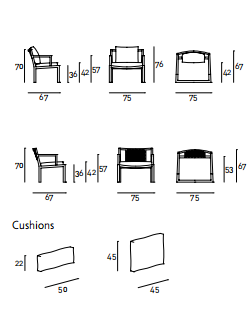 Small armchair with supporting frame in solid oak wood with acrylic painting finish, natural or charcoal dyed, or manual finishing in the color RAL K-7 3003 ruby red only. Backrest in multilayer, veneered and edged with oak plates, or weaved in hide, hempen rope, leather Scooby (braided leather trim) or profile in PVC, in the colours available in the collection. Seat chassis in lacquered steel, sprung with coated rubber elastic straps inserted into the seat cushion in differentiated density polyurethane foam, covered with a quilted mat in prewashed and sterilized goose down, stitched into separate compartments. Loose back cushion or lower back cushion in prewashed and sterilized goose down. Fabric or leather upholstery, both fully removable by zippers. Seat depth 53 - 42cm.