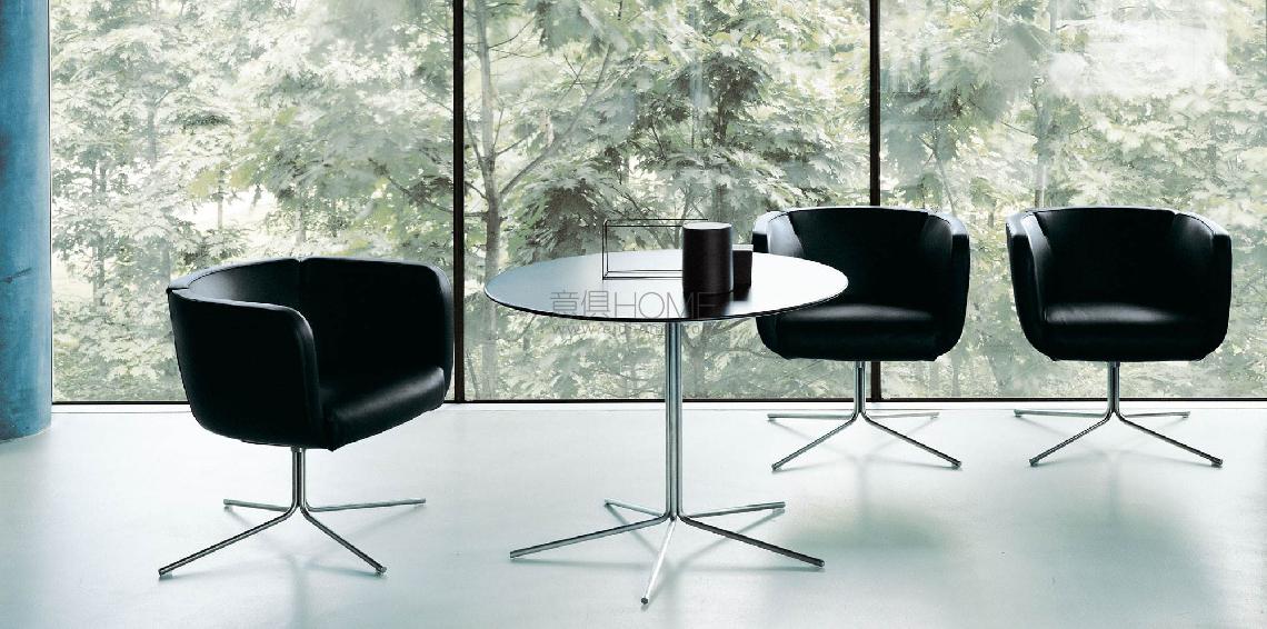 Armchair with steel frame embedded in cold-expanded polyurethane foam. Seat support in coated rubber elastic straps. Covering in needle punched, resinated, nonwoven polyester fibre, bonded onto a polyamide velveteen backing. Seat cushion in polyurethane foam, covered with acrylic fibre layers. Swiveling base in chromed finish steel or in steel laquered gunmetal grey colour. Floor support secured by with white or black PVC tips. Fabric or leather upholstery. The fabric version only is fully removable by zippers and Velcro fastenings, unscrewing the under seat cover in impact-resistant polystyrene. Seat depth 48cm.
