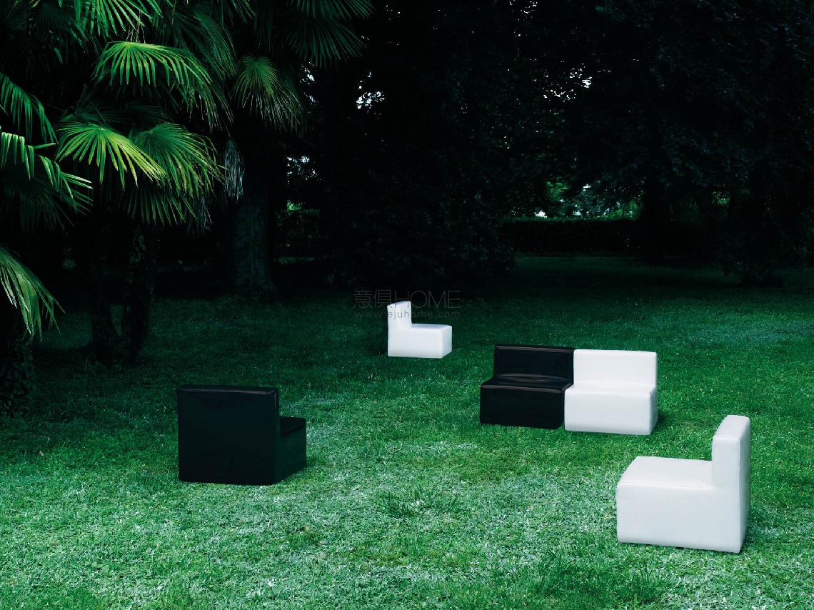 Small armchair available for indoor and outdoor. Indoor: seat frame in plywood, back panel in steel. Padding in differentiated density polyurethane foam. Covering in 100% polyether thermally bonded onto a polyamide velveteen backing. Fabric or leather upholstery. Outdoor: seat frame in marine plywood, back panel in steel. Padding in fine cell polyethylene. Upholstery with outdoor fabrics only. Both versions with black PVC feet or, on request, available on wheels and fabric upholstery only, fully removable by zipper and Velcro fastenings. Seat depth 46cm.