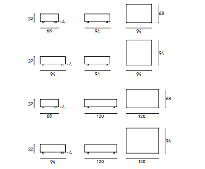 Modular elements of different dimensions, available for indoor and outdoor. Indoor version: frame in double-paneled poplar and pine. Support in cross-woven, coated rubber elastic straps. Padding in differentiated density polyurethane foam. Covering in needle punched, resinated, non-woven polyester fibre, bonded onto a polyamide velveteen backing. Fabric or leather upholstery. The fabric version only is fully removable by Velcro fastenings. All elements in leather have perimeter seams, and the upholstery is non-removable. Outdoor version: frame in steel lacquered for outdoor for bases and in steel lacquered for outdoor and plywood for outdoor for backrests and armrests. For bases only, support in cross-woven, coated rubber elastic straps and hooks in Stainless Steel for outdoor. Padding with open cell structure polyurethane foam DRYFEEL S, coated with draining fabric for outdoor. Upholstery with outdoor fabrics only completely removable by Velcro fastenings. Both versions with black adjustable PVC feet; the various elements are joined together by means of hooks. Seat depth 68-94-120-134cm.