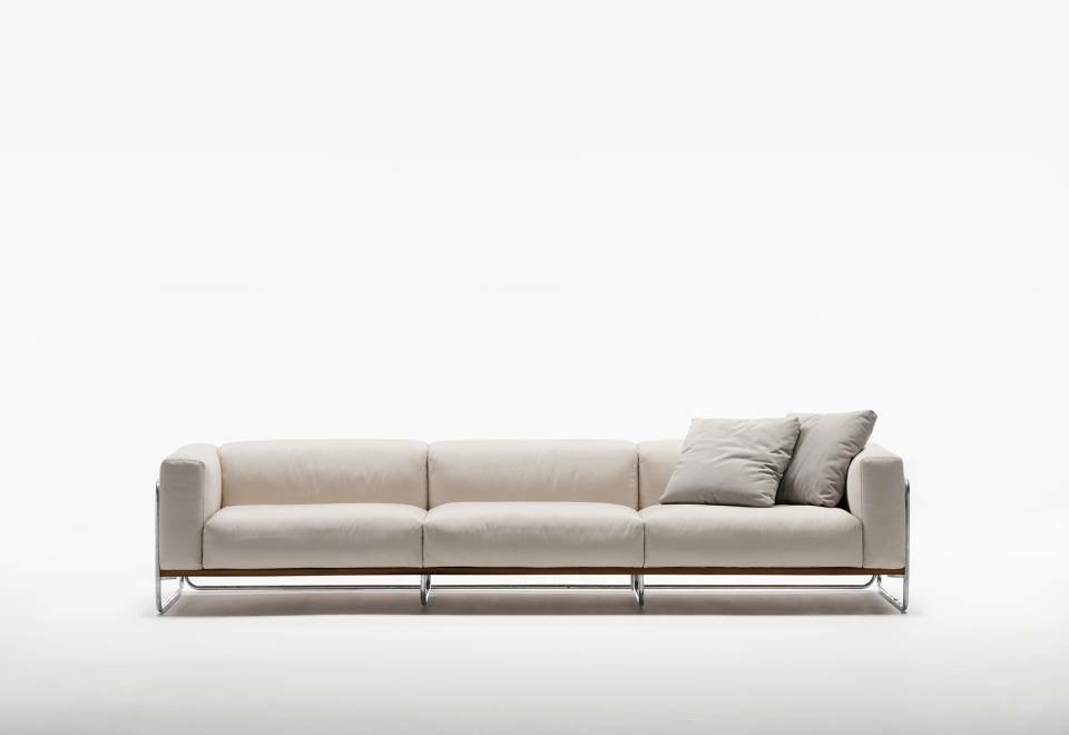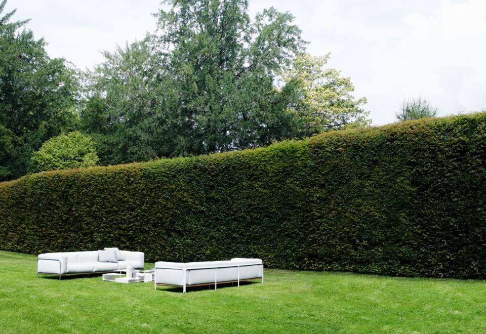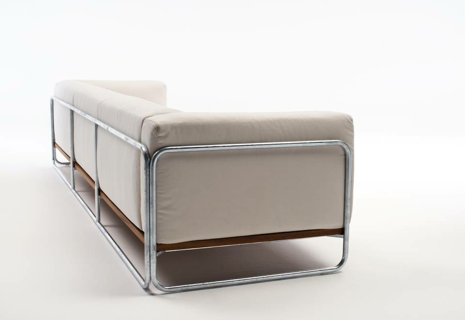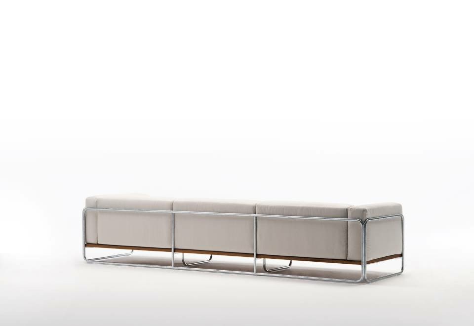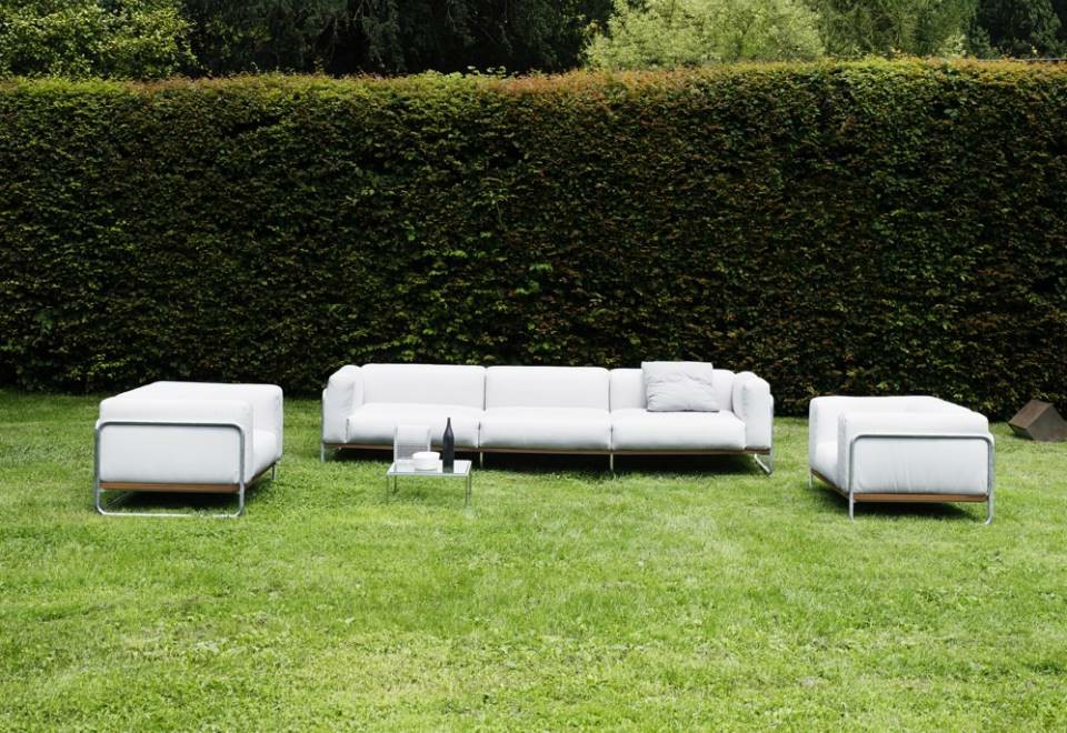Armchair and sofa with frame in curved tubular ?22mm Stainless Steel AISI 316 with mat satin finish or with epoxy polyester powder coating RAL-K7 9010 white or RAL-K7 9017 black. Seat panel with slats in kiln-stabilized solid Iroko wood, 28mm thickness, treated with a highly UV protective oil. Seat, backrest and armrests cushions in open cell structure polyurethane foam DRYFEEL S, covered with fibre for outdoor and with a waterproof fabric. Upholstery with outdoor fabrics only, fully removable by zippers. Seat depth 56cm
