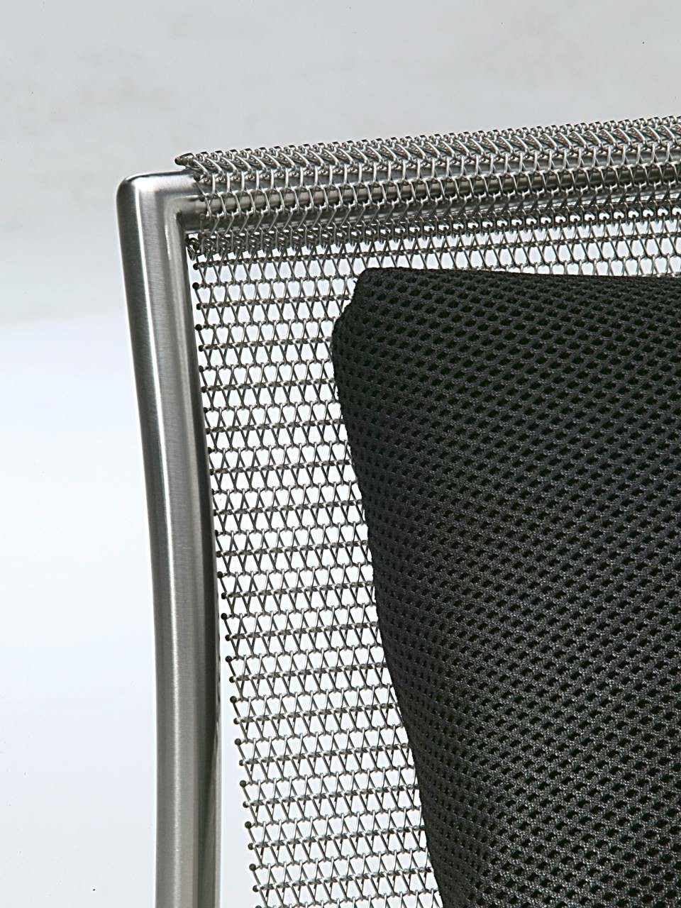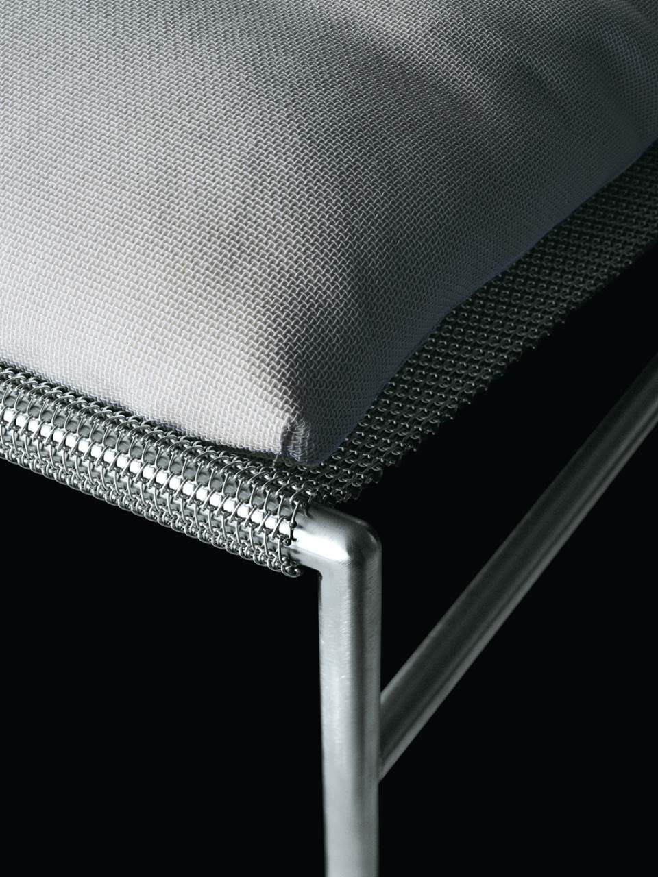 Support structure in AISI 316 stainless steel with mat satin fifi nish. Flexible feet in nylon. Upholstered in AISI 316 stainless steel mesh. Seat cushion in polyurethane foam for outdoor use. Seat depth 68cm.