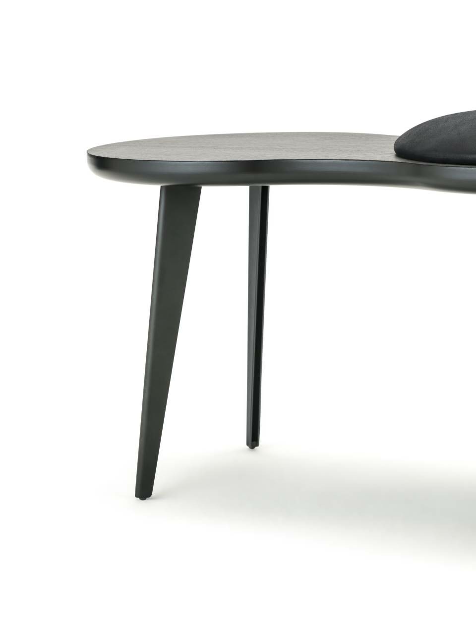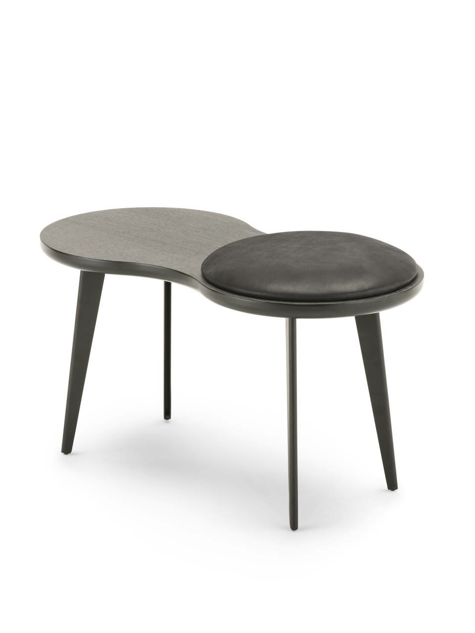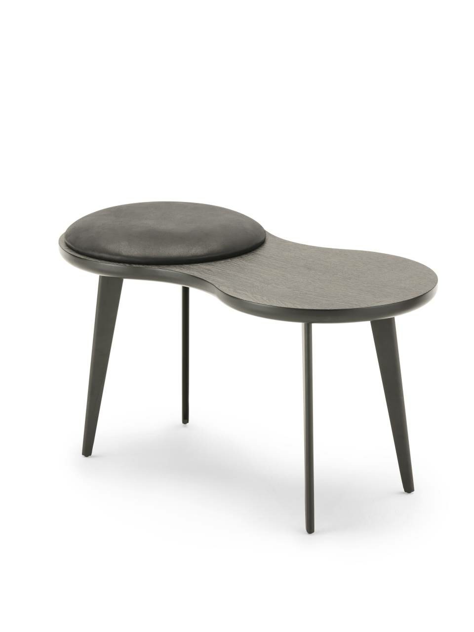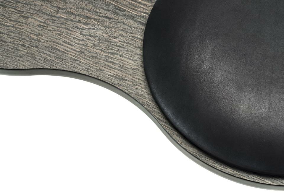 Coffee table and stool composed of contoured legs in steel sheet and epoxy powder coating in RAL- K7 9017 black; top in “sandwich” of MDF and aluminum sheet pressed and glued together with embedded steel plates for the fixing of the legs, veneered in oak, natural or charcoal dyed, or Stone Oak?, while the edge and the bottom are always matt satin- finish. For the stool version, chassis seat in multilayer poplar wood and padded with polyurethane foam, covered with acrylic fibre layers. For the table version, tray covered in leather or felt. Floor support secured by plastic feet.