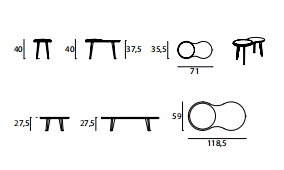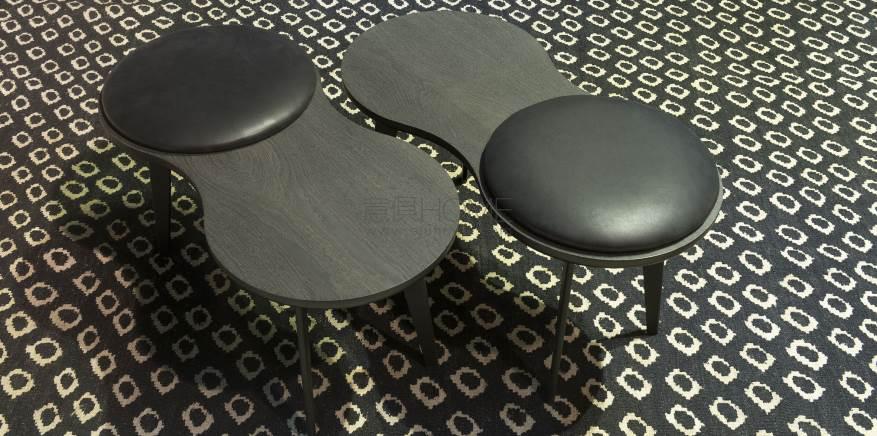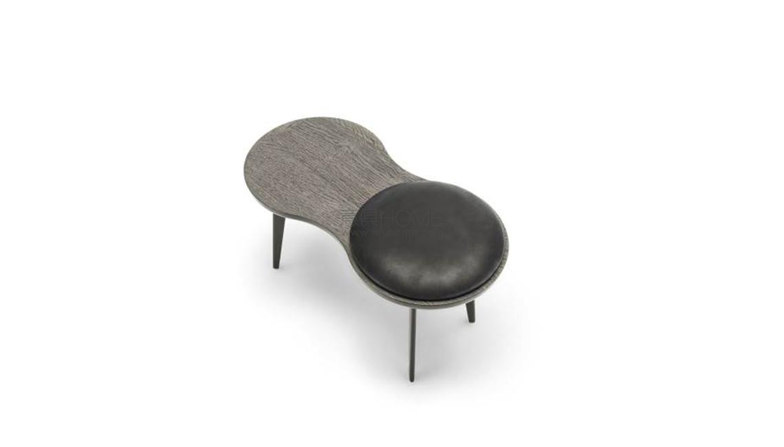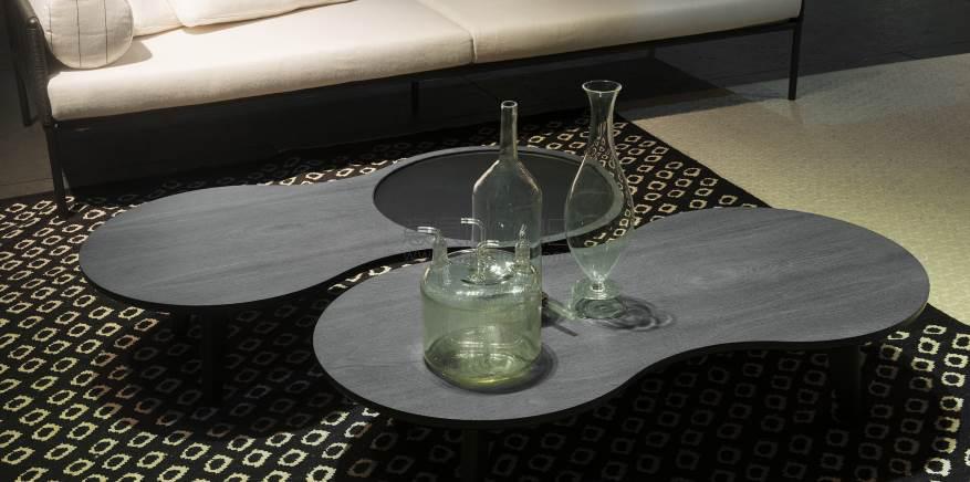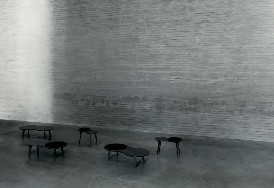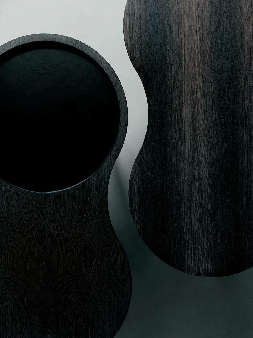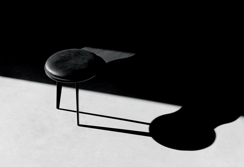 Coffee table and stool composed of contoured legs in steel sheet and epoxy powder coating in RAL- K7 9017 black; top in “sandwich” of MDF and aluminum sheet pressed and glued together with embedded steel plates for the fixing of the legs, veneered in oak, natural or charcoal dyed, or Stone Oak?, while the edge and the bottom are always matt satin- finish. For the stool version, chassis seat in multilayer poplar wood and padded with polyurethane foam, covered with acrylic fibre layers. For the table version, tray covered in leather or felt. Floor support secured by plastic feet.