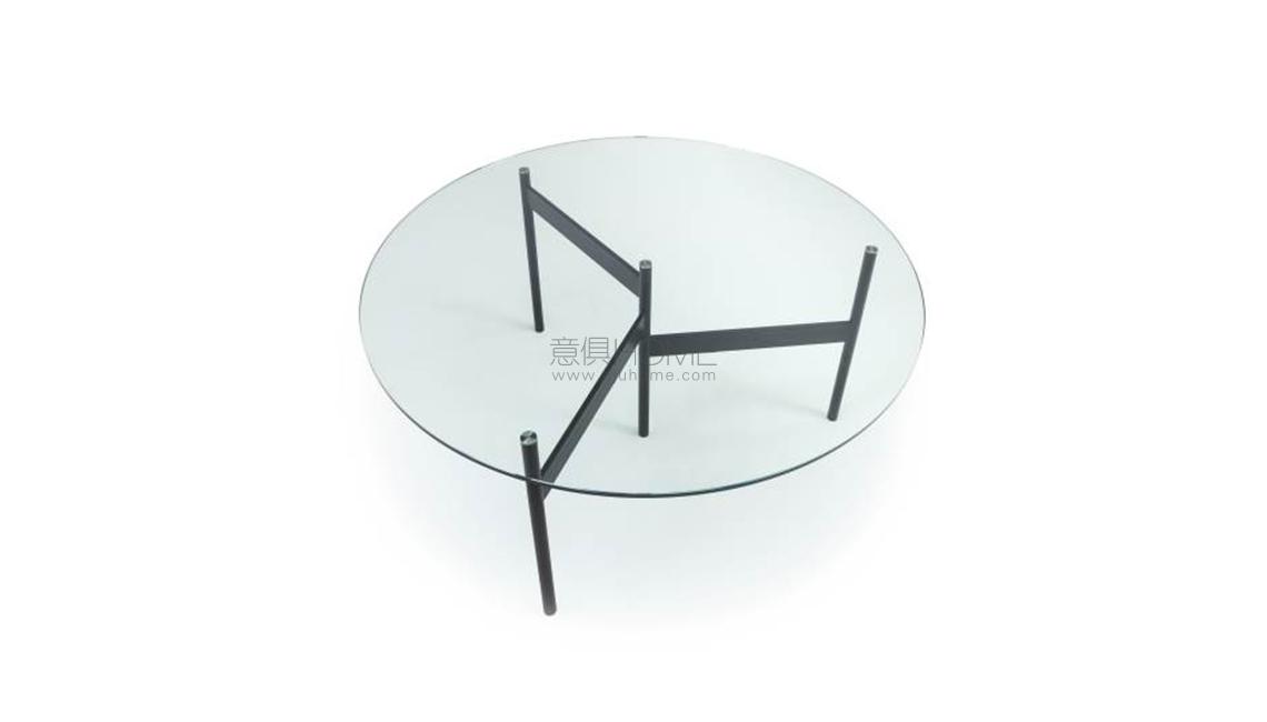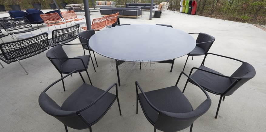 Table available for indoor and outdoor, with granite, smoked grey glass or blu-tinted glass top (indoor/outdoor use), wood, marble or clear glass top (indoor use only). Indoor/outdoor version: ? 30mm tubular steel frame with junction steel bar, section 80x15mm, coated with polyester epoxy powder gunmetal colour with black PVC tips. Top in black absolute Zimbabwe granite or in marble white Carrara, black Marquinia, Sahara Noir or red Levanto, with an undertop in black HPL, fitted with small plate with a conical counterbore to align and fix it to the base. The marble version provides a satin finish and an opaque transparent protective varnish or a matt or glossy polyester finish. Top in wood, with water-based acrylic paint finish, made in “sandwich” of MDF and aluminum sheet pressed and glued together, veneered with 10/10 plates of chestnut, natural or charcoal dyed or Stone Oak?; beveled edge and bottom always matt satin lacquered in the finish of the top. Top in 12mm tempered clear glass or smoked glass, or in 10mm tempered blu-tinted glass, to which are fixed, with a UV-cured adhesive, small plates with a conical counter bore to align it with the structure. All top versions are secured to the frame by means of tie rods.