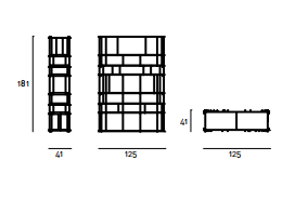 Bookshelf made of solid wood splints of various sizes, thickness 20x20mm assembled together. Finishes: natural oak, american walnut or walnut charcoal-dyed with water-based acrylic paint finish. 6 shelves in clear tempered glass 6mm thick. The base/lower shelf is always in wood, same finish as the bookshelf, with insert of a stabilizer weight.