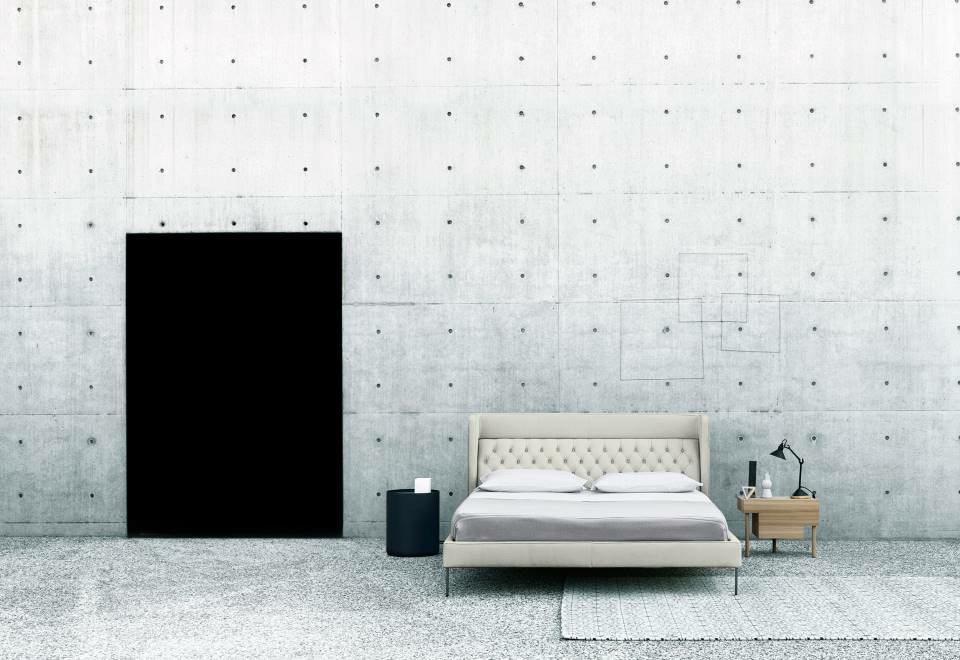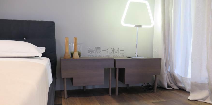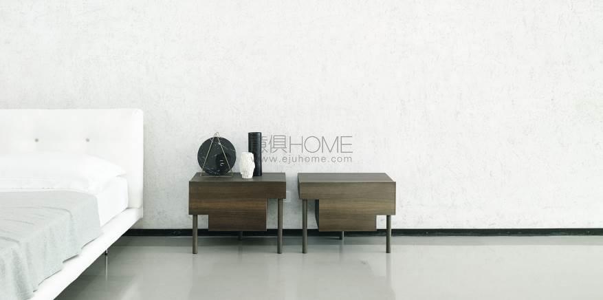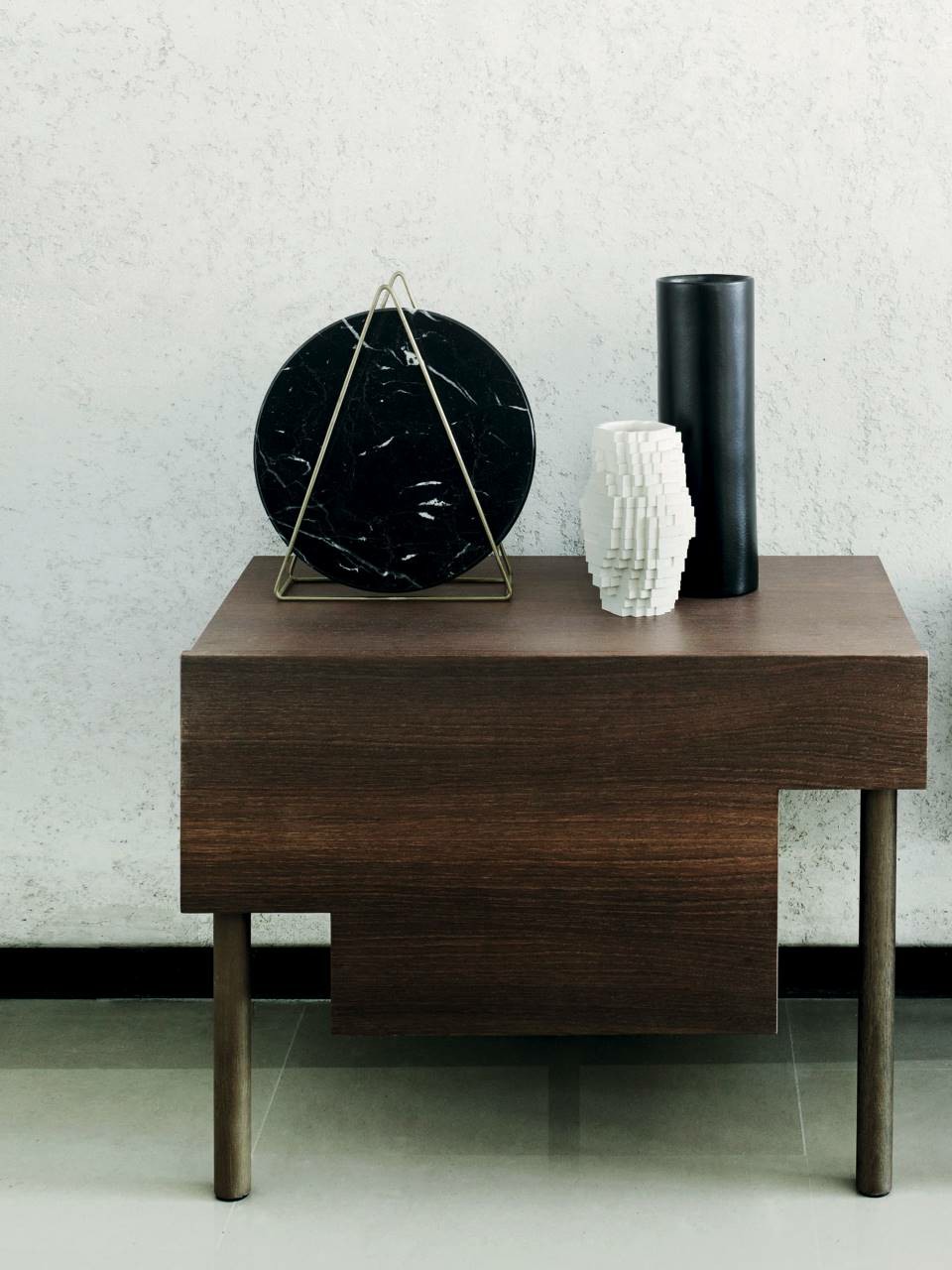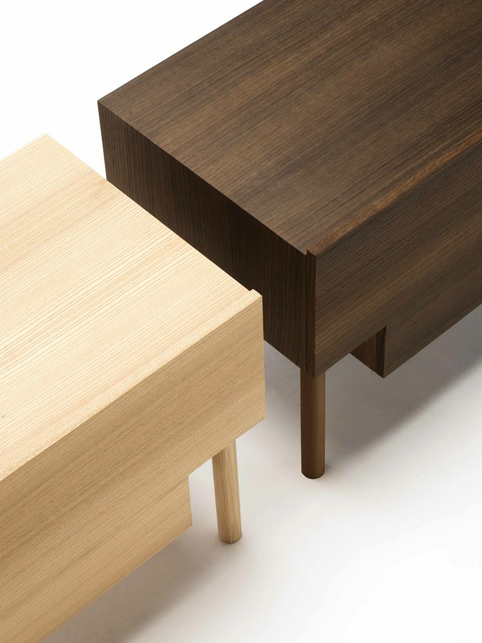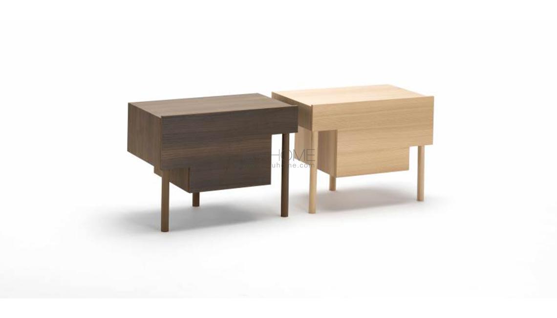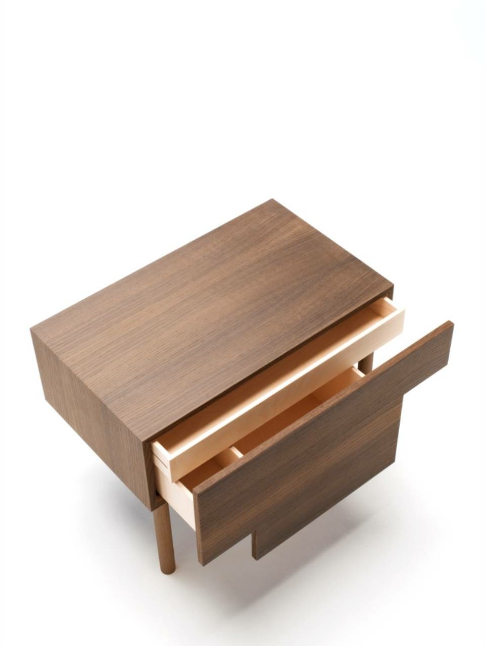 Bedside table with supporting frame in “folding” of MDF 15mm thick veneered with elm or Thermo oak plates with water-based acrylic paint finish. Legs in solid oak ?30mm, each with different height: 15, 25 and 35cm. Front panel in 15mm thick MDF veneered with elm or Thermo oak plates, with pull-out natural birch drawer on Blum? runners, with two compartments of different height and volumes, and one trinket drawer. Available in right and left version.