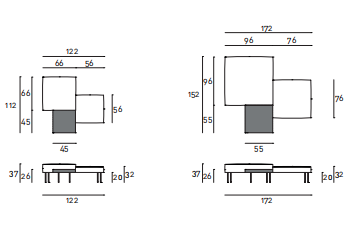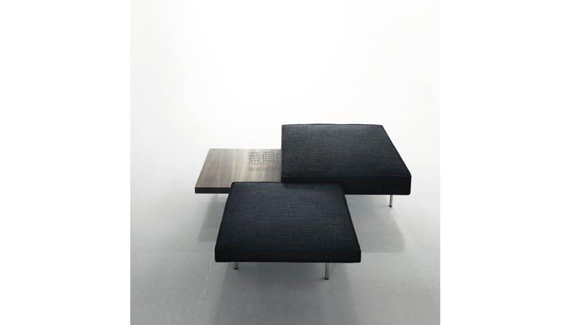 Element composed by a coffee table and two seating elements, with supporting frame in epoxy powder coated steel. Stainless steel feet ?15mm, matt satin-finish, screwed to the base with a bushing. Table top in MDF 20mm thick, veneered with elm or Thermo oak plates with water-based acrylic paint finish. Seating elements in multilayer, padded in differentiated density polyurethane foam covered in needle punched, resinated, nonwoven polyester fibre, bonded onto a polyamide velveteen backing. Fabric or leather upholstery, both full removable by Velcro fastenings.