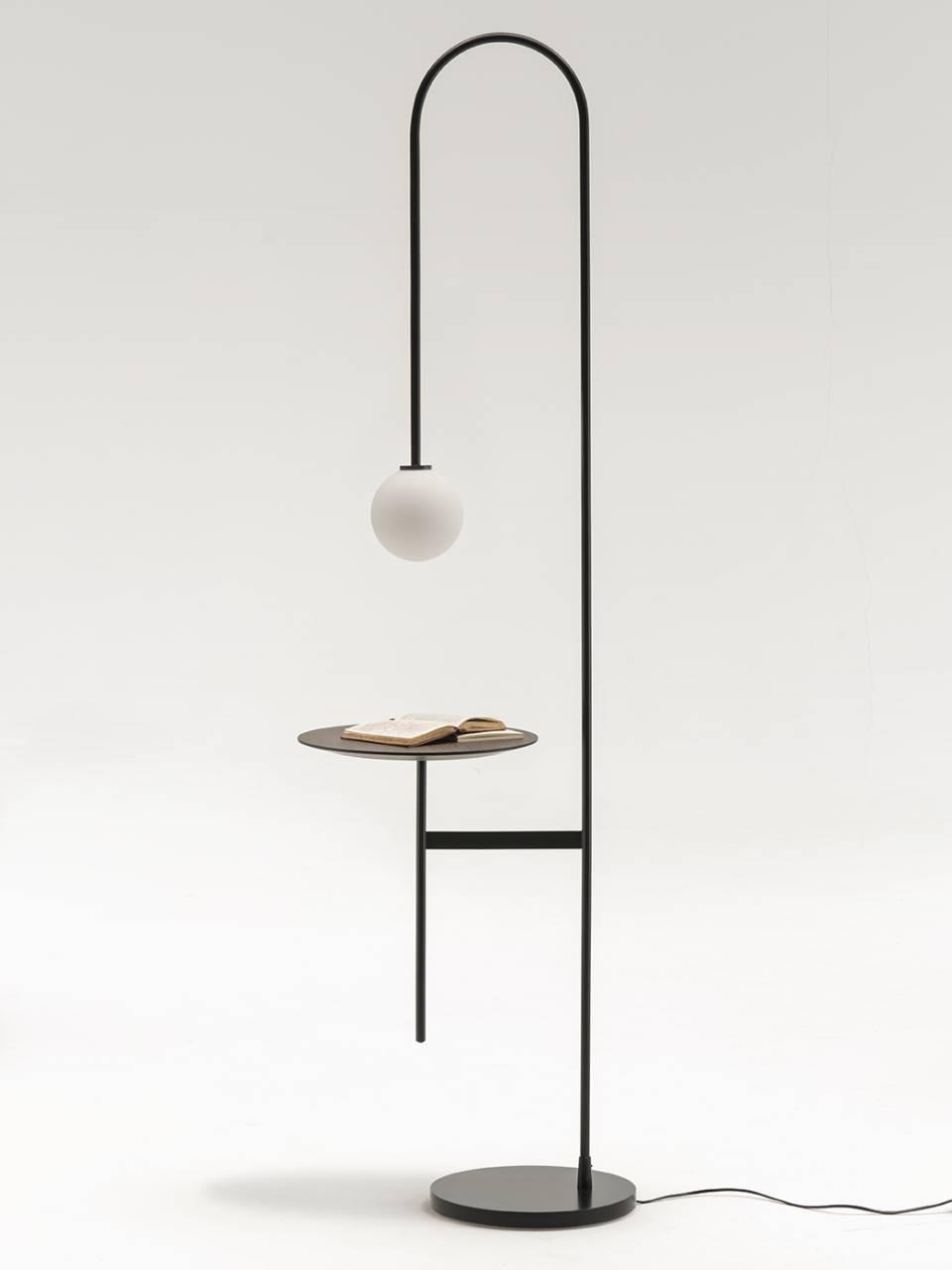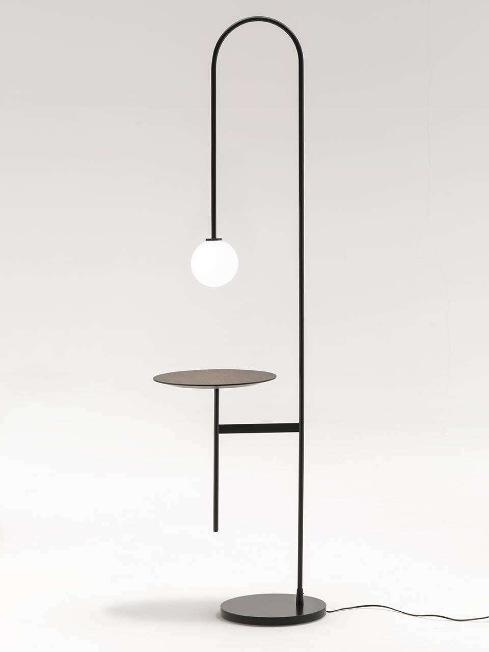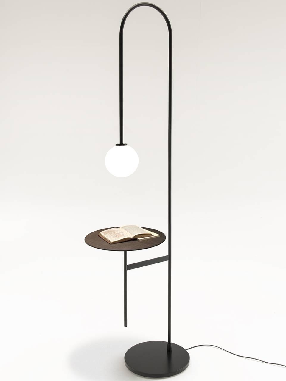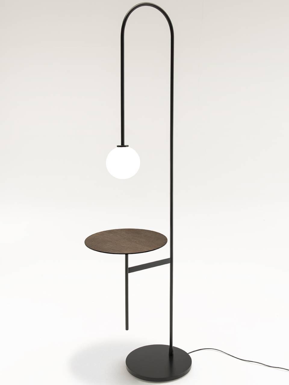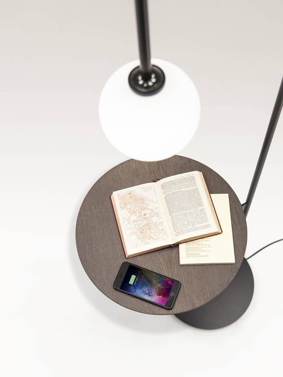 Floor lamp for indoor use with diffused light and integrated small table equipped with wireless charging and touch light switch. Structure in different sections tubular steel with base in 10 mm lasercut steel sheet, calendared ring and bottom in laser-cut steel sheet 3 mm thick, finished with matt black epoxy powder coating. The base houses a transformer for wireless charging and a power supply for switching on/off the lamp. Table top ?39 cm available lacquered matt black or veneered, on the upper part only, in charcoal-dyed oak or Stone Oak?, with acrylic painting finish; edge and bottom always lacquered matt black. Blown glass opal diffuser ?15 cm fixed to the lamp by means of a threaded ring. Floor support secured by black PVC feet. Power cord length 260 cm. The lamp is supplied with 1 LED light source 4W 330 lm 3000K G9. Voltage 110/230 V. Lamps are cabled according to European CE laws.