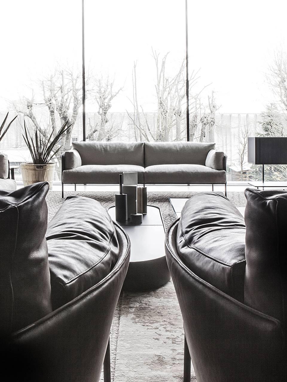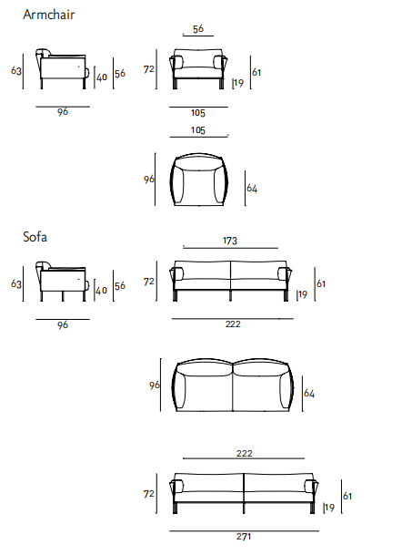 Sofa, available in fix measures 222/271/320cm, depth 96cm  and armchair 105cm depth 96cm, with supporting structure in  lacquered tubular steel, 60x30mm section, seat sprung with  coated rubber elastic straps and polyurethane foam.  Backrest and armrest structure in tubular steel embedded  in cold- expanded polyurethane foam with covering in 100%  polyether, thermally bonded onto a polyamide velveteen backing,  screwed to the supporting structure. Seat, armrests and backrests cushions in prewashed and  sterilized goose down, stitched into separate compartments,  with performed polyurethane foam insert.  Steel rod feet ?22mm, screwed to the backrest structure with a  bushing, welded within the structure and seat cushions support  bar, in ?20mm steel tube, fixed to the base by screw-spacer,  with gunmetal grey epoxy powder coating.  Floor support secured by adjustable black PVC feet. Cushions upholstery in fabric or leather, both fully removable by  zippers and Velcro fastenings; backrest and armrest structure  upholstery removable by Velcro fastenings for the fabric version  only, while always fix when in Cuoietto or leather. Seat depth 64cm.