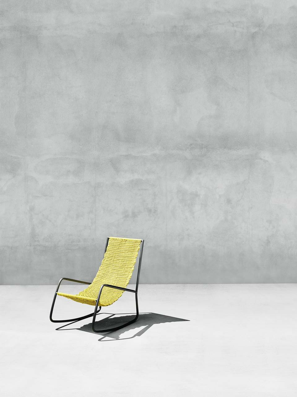 Rocking Chair available for indoor and outdoor. Indoor version: supporting frame in ?25mm tubular steel coated with polyester epoxy powder gunmetal grey colour and black PVC runners. Non-removable upholstery, hooked to the frame through technical parts coupled to it, available in fabric or leather sewn together with a supporting material. Small armrest in steel sheet, secured to the frame with screws, coupled with non-removable black hide or coated with polyester epoxy powder gunmetal grey colour. Outdoor version: supporting frame in ?25mm tubular Stainless steel AISI 316 coated with polyester epoxy powder gunmetal grey colour and black PVC runners. Non-removable upholstery hooked to the frame through technical parts coupled to it, available in the outdoor fabrics only, sewn together with a supporting material. Small armrests in Stainless steel, secured to the frame with Stainless steel screws, coated with polyester epoxy powder gunmetal grey colour. For both versions, upholstery available woven with an hypoallergenic, recyclable, eco-friendly tubular (Readymade UnPizzo) suitable both for indoor and outdoor, in the colours in collection.
