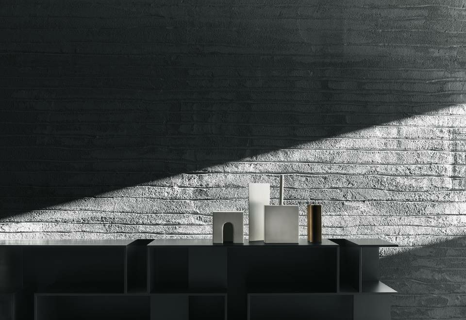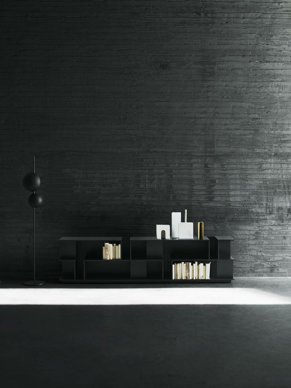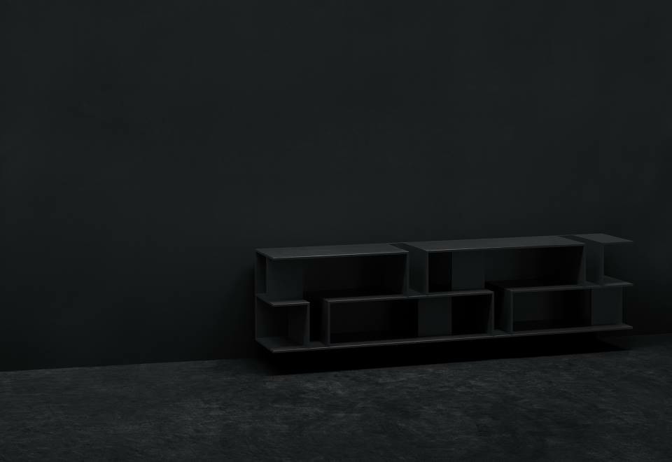 Storage unit, available in two versions: Floor-standing unit: supporting frame, 12 mm thick, made in folding, in “sandwich” of MDF and aluminum sheet pressed and glued together and MDF plinth, matt black lacquered with integrated black adjustable PVC tips. Wall-mounted unit: supporting frame, 12 mm thick, made in folding, in “sandwich” of MDF and aluminum sheet pressed and glued together, with a steel bar embedded in the back side, fitted with threaded holes which allow to install it on the wall through an MDF frame, matt black lacquered, with integrated hook and inclination-control system (height, depth and inclination). Wall-mounted version maximum load: . 240cm Cabinet/Unit: 90Kg . 120cm Cabinet/Unit: 40Kg