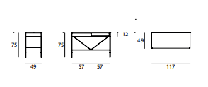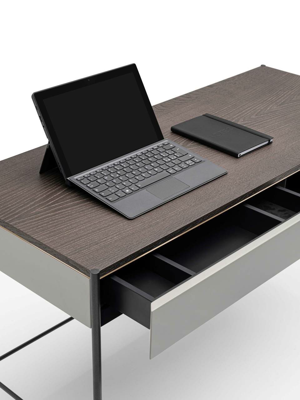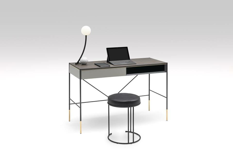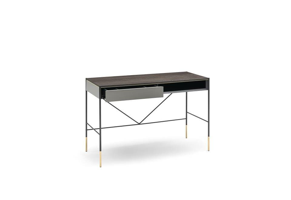 Writing desk consisting of a central part in MDF, with external parts in MDF veneered in Stone Oak? or walnut lacquered ‘Canaletto’ or polished in glossy finish RAL-K7 3005 Red Wine, RAL-K7 5020 Ocean Blue, RAL-K7 7030 Stone Grey, RAL-K7 7039 Quartz Grey or RAL-K7 9001 Cream; frontal part divided into an open compartment L.53cm, H.8,7cm e P.44, 5cm, always lacquered in matt black, and drawer on Blum? runners, with three compartments of different heights and volumes. MDF top thickness 18mm, paired with a 3mm thick sheet frame in steel painted brass, veneered in Stone Oak? or walnut lacquered ‘Canaletto’, coupled with the central body by means of bushes and pins. Brass feet screwed to the ?16mm round steel legs, with integrated fastening elements, connected to each other by steel rods ? 10mm. Floor support secured by black PVC feet. All metal parts are coated with epoxy powder gunmetal grey colour and brass elements are satinized and finished with a transparent matt varnish.