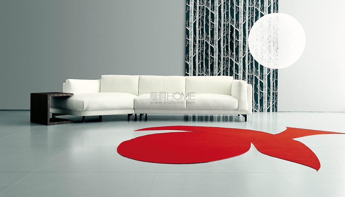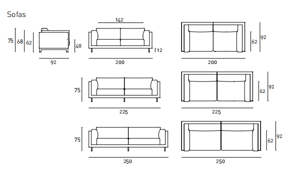 Fix sofa with one-piece frame in double-paneled poplar and pine. Steel seat chassis with support in cross-woven, coated rubber elastic straps. Shell padding in differentiated density polyurethane foam. Covering in needle punched, resinated, non-woven polyester fibre, bonded onto a polyamide velveteen backing. Seat, back and armrest cushions in prewashed and sterilized goose down, stitched into separate compartments, with preformed polyurethane foam insert, or in polyurethane foam, coated with acrylic fibre layers. Steel feet, with satin nickel finish joined by a bracket. Fabric or leather upholstery. The fabric version only is fully removable by zippers and Velcro fastenings. The leather version is always with non-removable upholstery. Seat depth 62cm.