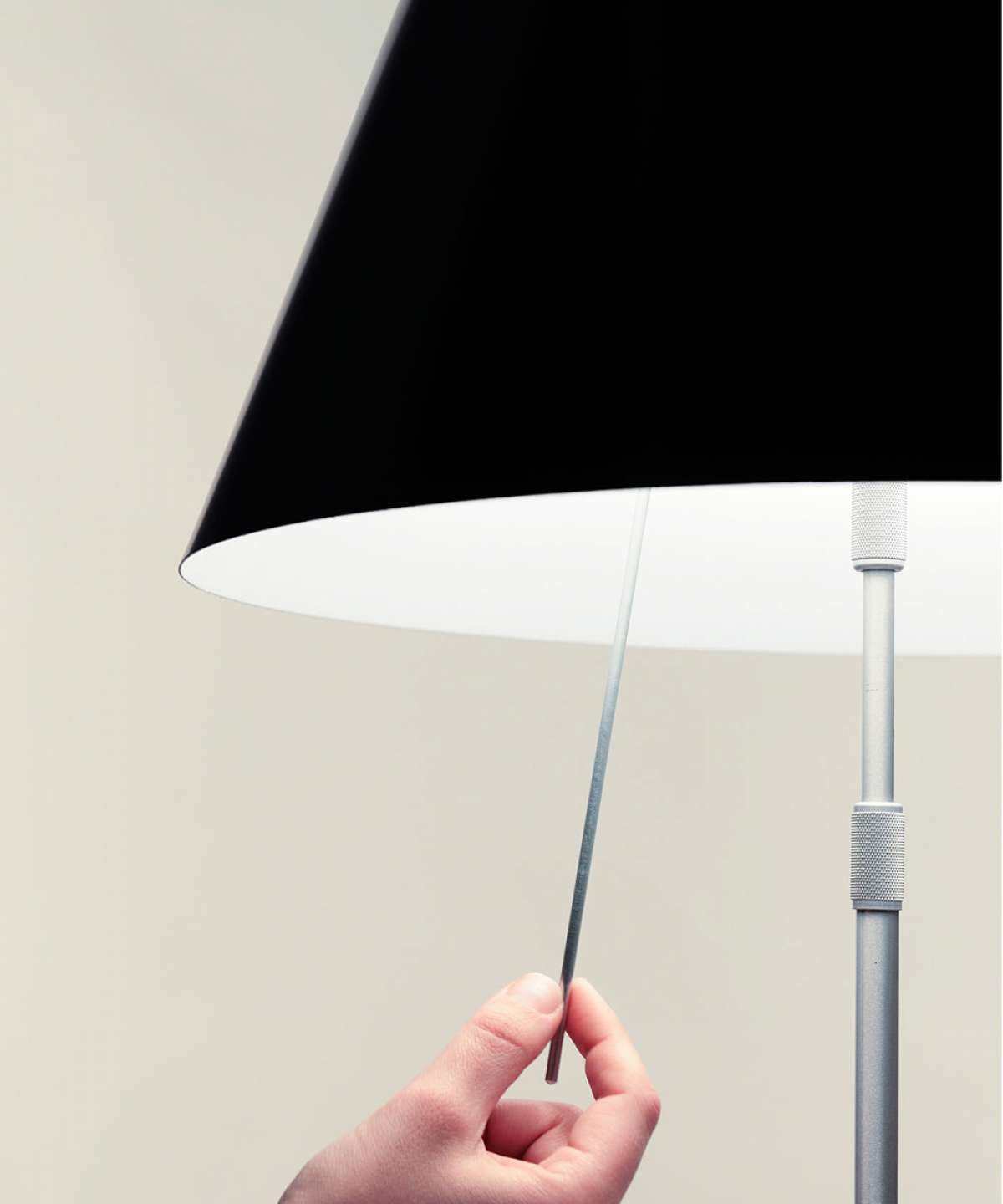 Elegant and light, this lamp emits a pleasant warm light through a silk-screened polycarbonate shade. The lamp’s height may be adjusted by means of a characteristic steel counterweight.
