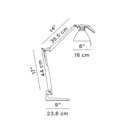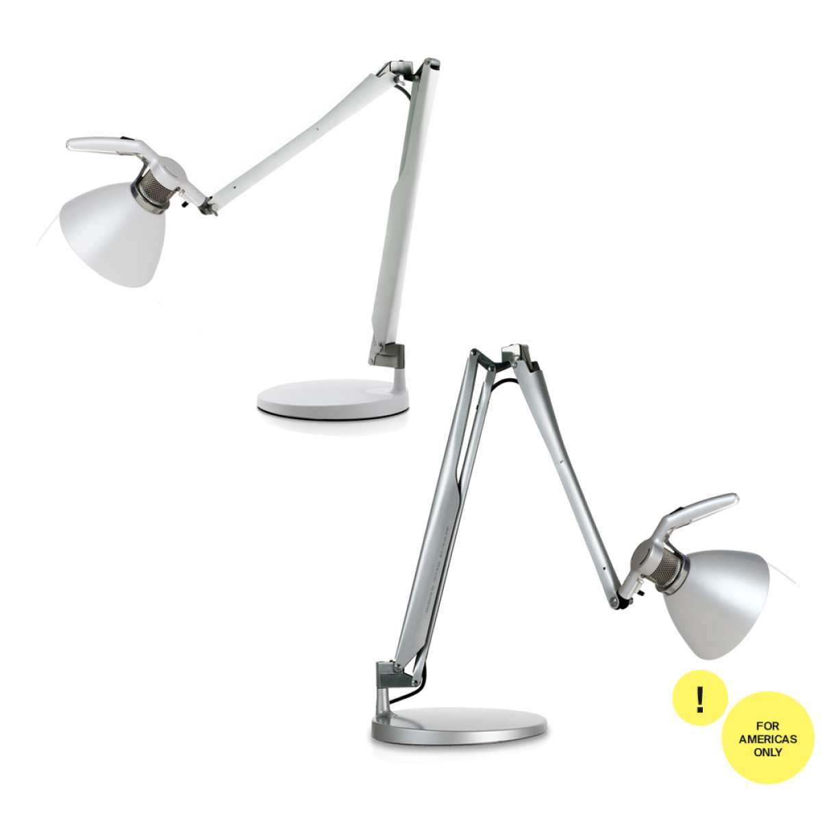 Fortebraccio sets new standards of efficiency and practicality for desk lamps. The central joint allows the two arms to rotate independently on the horizontal and vertical axes, guaranteeing great fluidity of movement even in extreme and unusual positions. The polycarbonate grip enables users to maneuver the lamp simply and manageably.