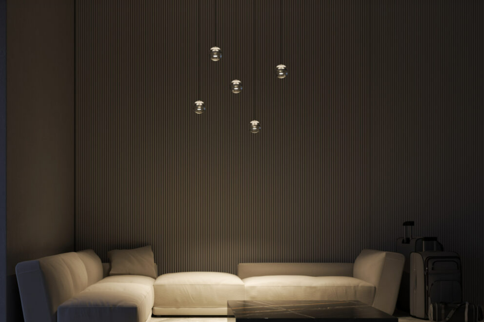 The height and position with respect to the central axis of the individual elements are easily adjustable during installation, thus leaving the possibility of customizing the aesthetic appearance and the luminous effect of Limbus Chandelier.