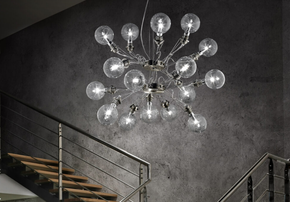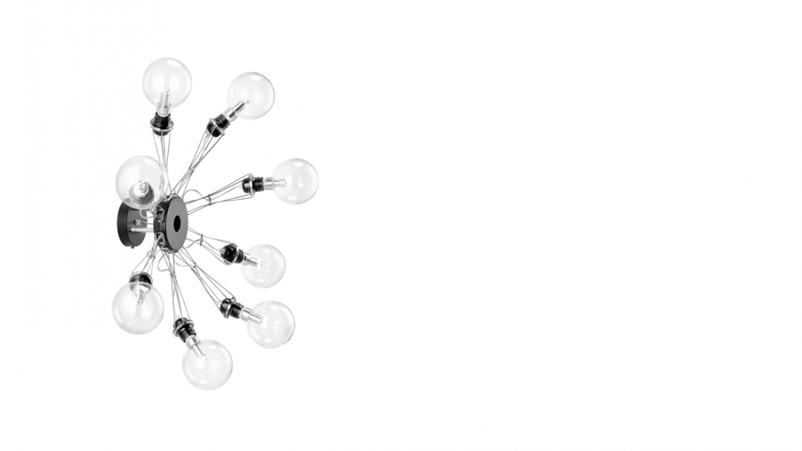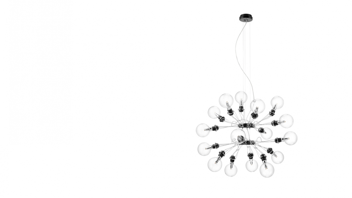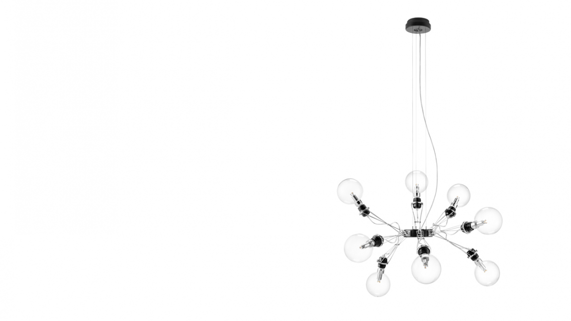 a pendant lamp whose huge expressive impact lies in the original composition of its eight thin steel arms. Tracing the shape of a star, they look like a mechanical octopus with E27 lightbulb fittings on the ends of its ‘tentacles’. In this way, light is emitted in all directions.