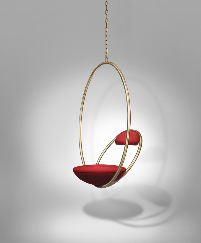 Suspended from above, two black powder coated steel circular hoops join to create the Hanging Hoop Chair, with a seat and backrest upholstered in Kvadrat wool.