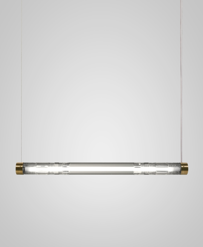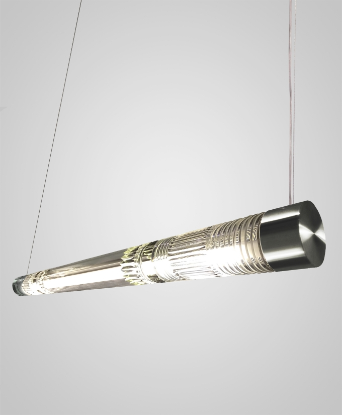 Composed of a decoratively patterned length of hand-cut lead crystal which is capped at each end, Crystal Tube contains a slender LED light source resulting in a sparkling beam of light. A luxurious reimagining of the standard fluorescent tube light, Crystal Tube is suspended from both ends by a thin tensile wire allowing it to be hung horizontally or at an angle.
