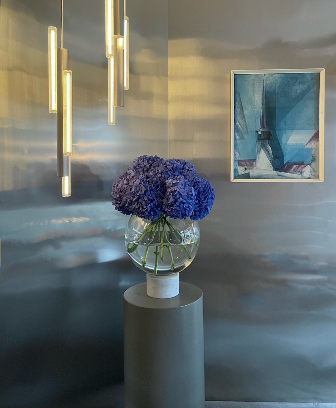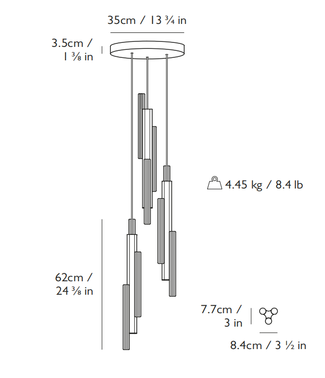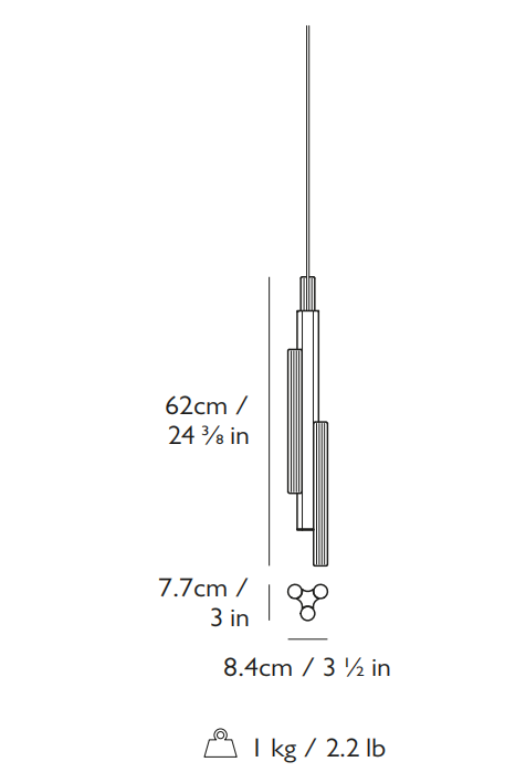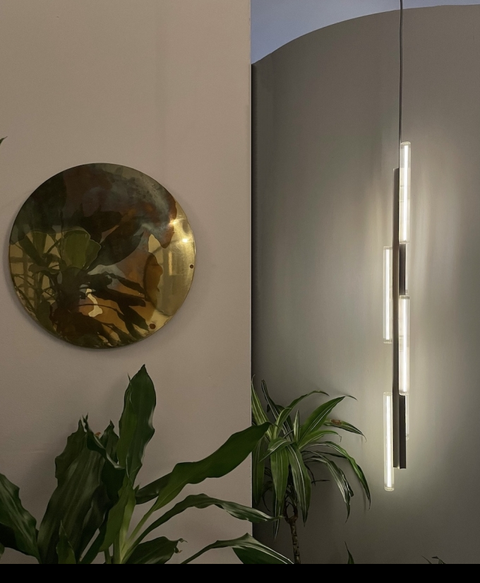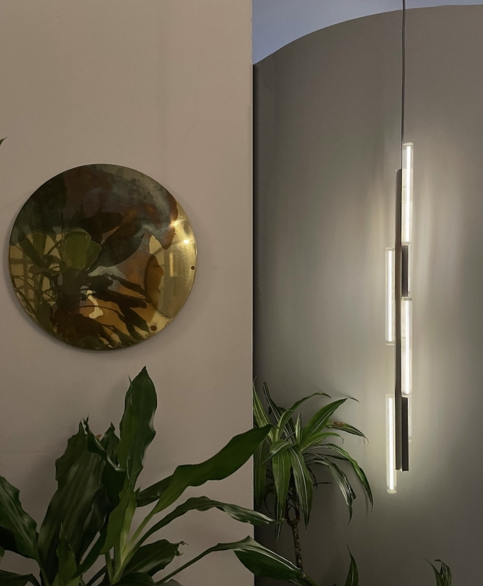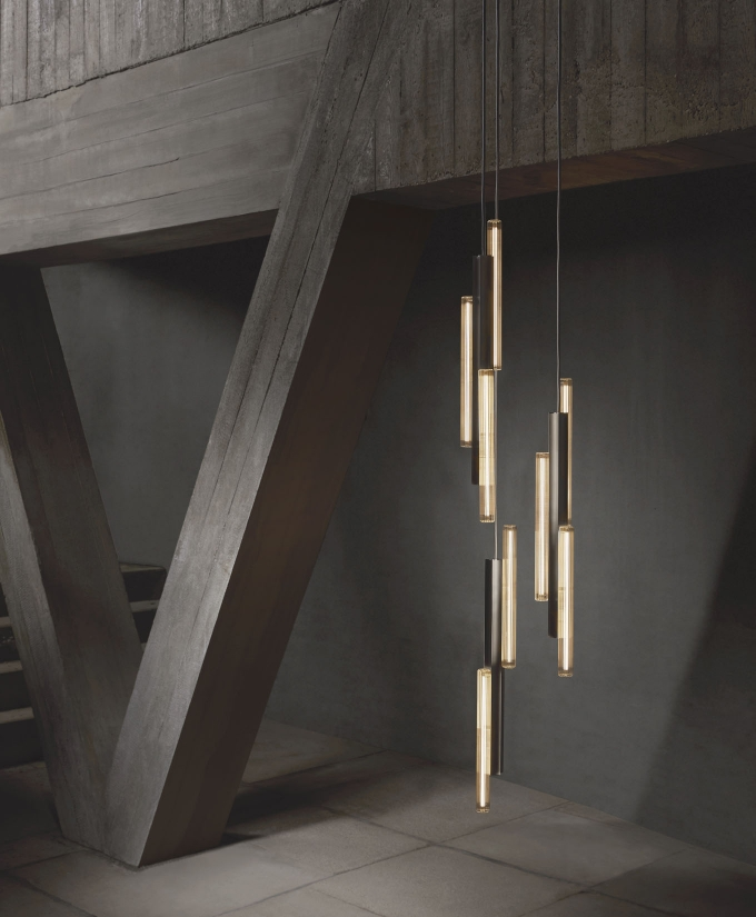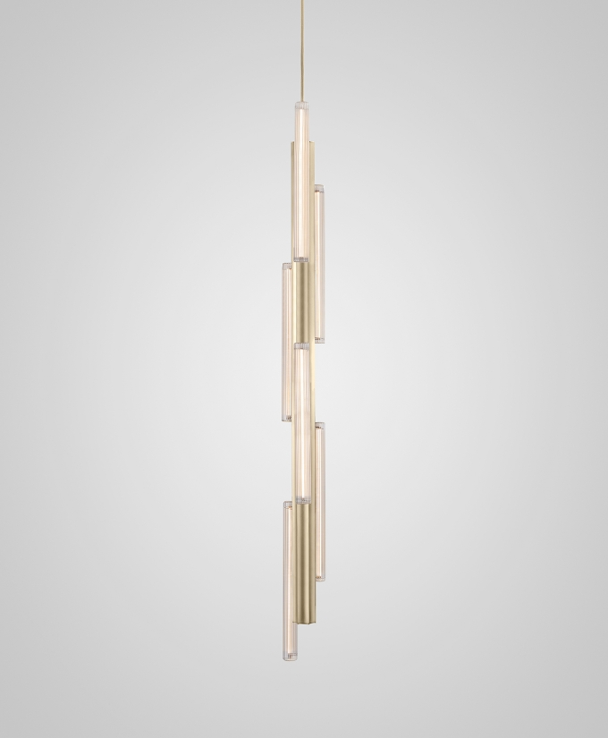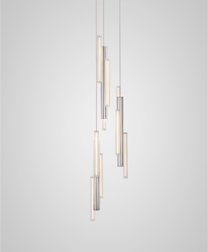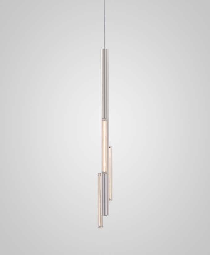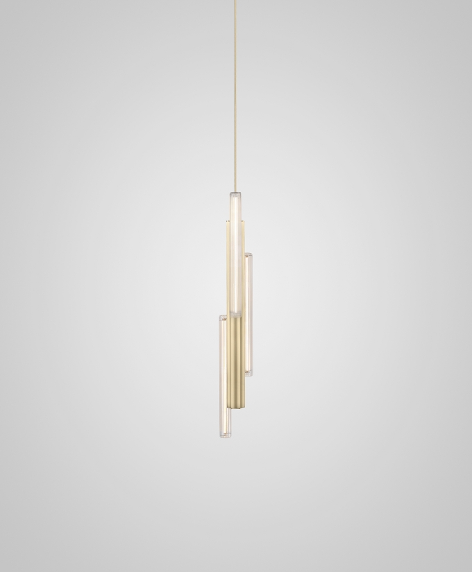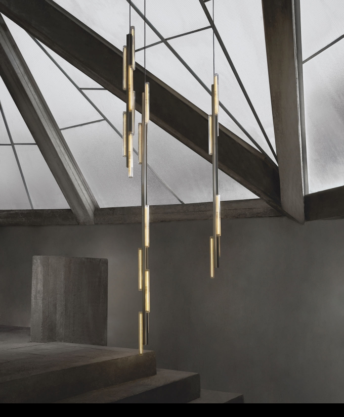 Hail is inspired by the shards of light and shadow often experienced from lancet windows in vast church arches. Available in three standard sizes in a gold or silver brushed finish, Hail has an elongated fluted form fabricated in aluminium with asymmetrically positioned reeded glass lightbulbs placed along its structure. The lights can also be connected to create unique customisable configurations.