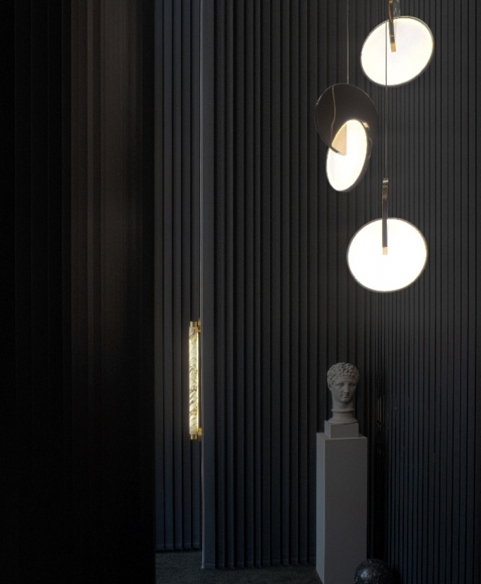 Continuing the exploration of pivots and supports, Fulcrum Light is a slimline pendant of gold, chrome or black cylinders suspended around a central sphere.