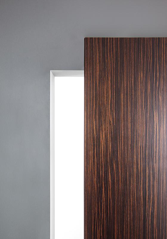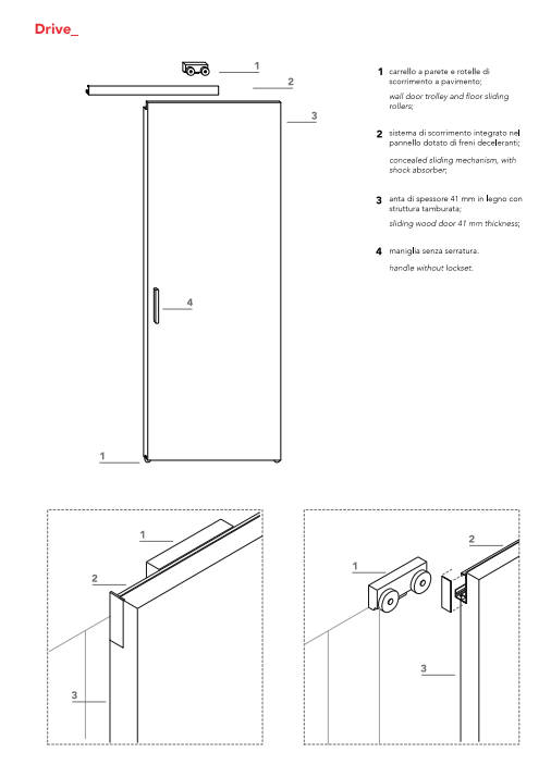 Sliding wood door 41 mm thick. Wall door trolley and floor sliding rollers. Concealed sliding mechanism with shock absorber. Installation on pre-squared wall.